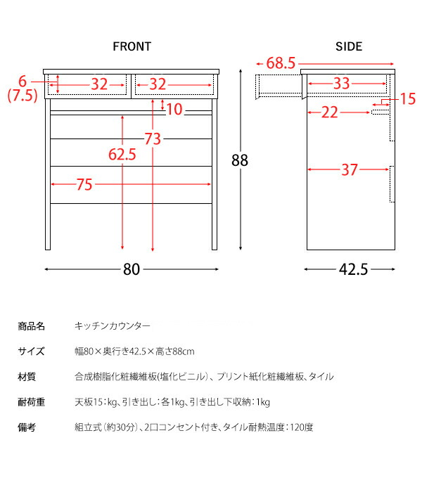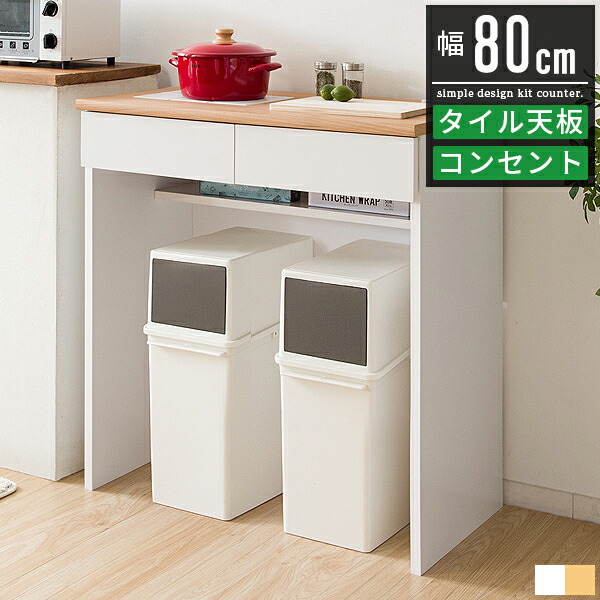 キッチンカウンター テーブル ダストボックス ゴミ箱 上 レンジ 食器 キッチンラック スリム キッチン 収納 棚 作業台 カウンター レンジ台 キッチン収納棚 オープンカウンター 木製 タイル天板 幅80cm 引き出し 白 ホワイト 北欧 ナチュラル かわいい シンプル モダン レトロ フレンチカントリー コンセント付き
