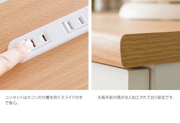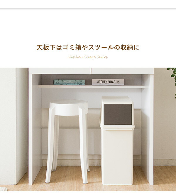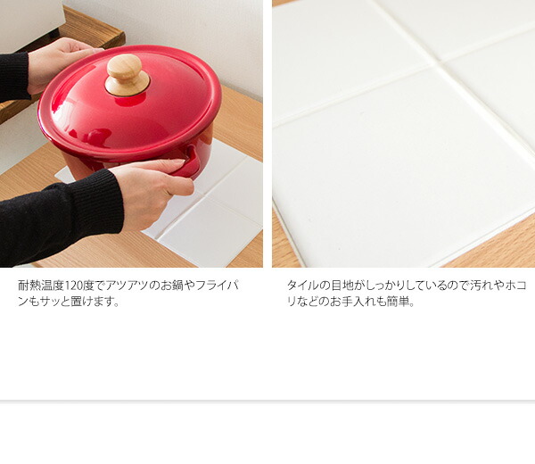 天板上にはタイルが敷かれており、熱いお鍋やトースターを置くことができてとても便利。高さ88cmで調理など作業テーブルとして使いやすい高さ設計で快適です。天板下のスペースはゴミ箱やキッチンスツールの収納としてお使いいただけます。収納力・インテリア性がより充実する同シリーズのキッチンラックやキャビネットもご用意しており、キッチンを統一感のある爽やかな空間に演出してくれます。