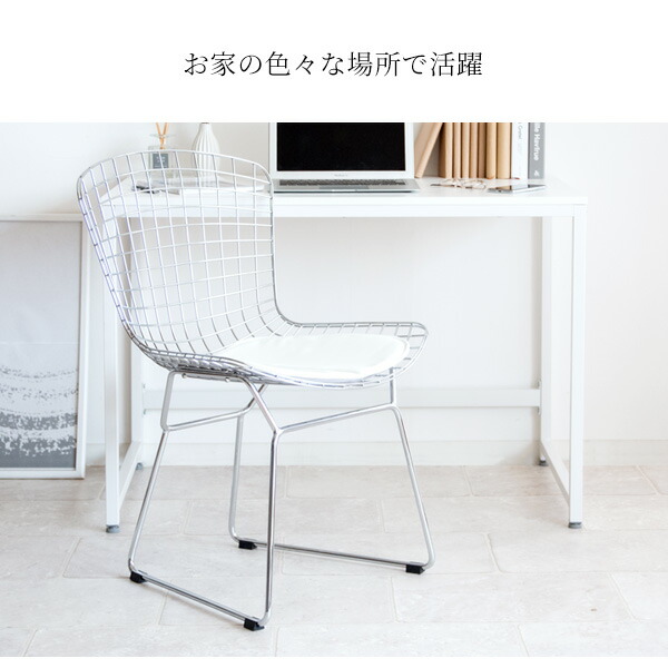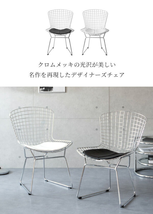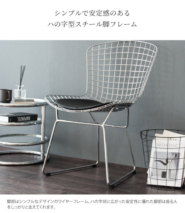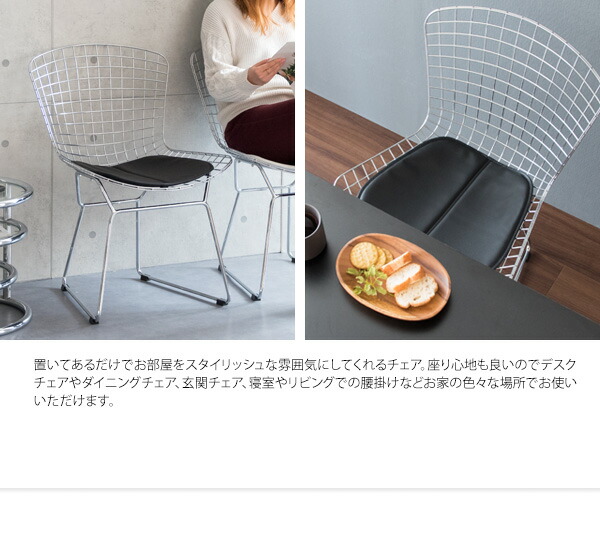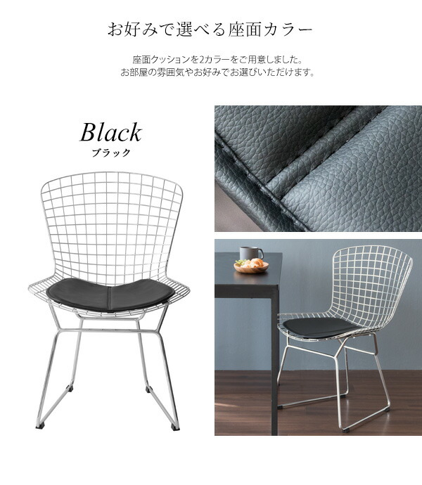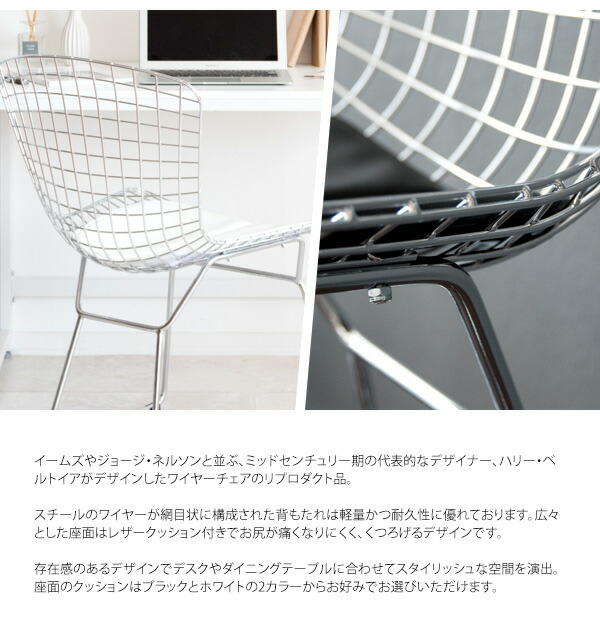 イームズやジョージ・ネルソンと並ぶ、ミッドセンチュリー期の代表的なデザイナー、ハリー・ベルトイアがデザインしたワイヤーチェアのリプロダクト品。スチールのワイヤーが網目状に構成された背もたれは軽量かつ耐久性に優れております。広々とした座面はレザークッション付きでお尻が痛くなりにくく、くつろげるデザインです。存在感のあるデザインでデスクやダイニングテーブルに合わせてスタイリッシュな空間を演出。座面のクッションはブラックとホワイトの2カラーからお好みでお選びいただけます。