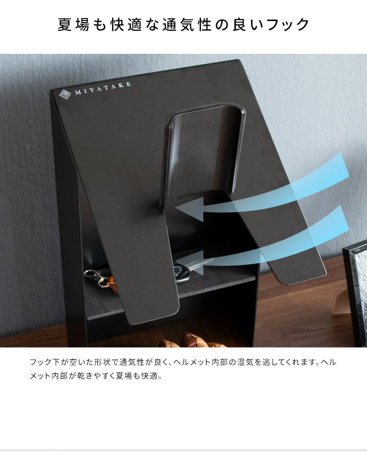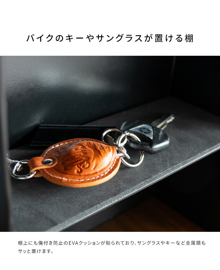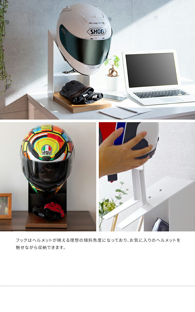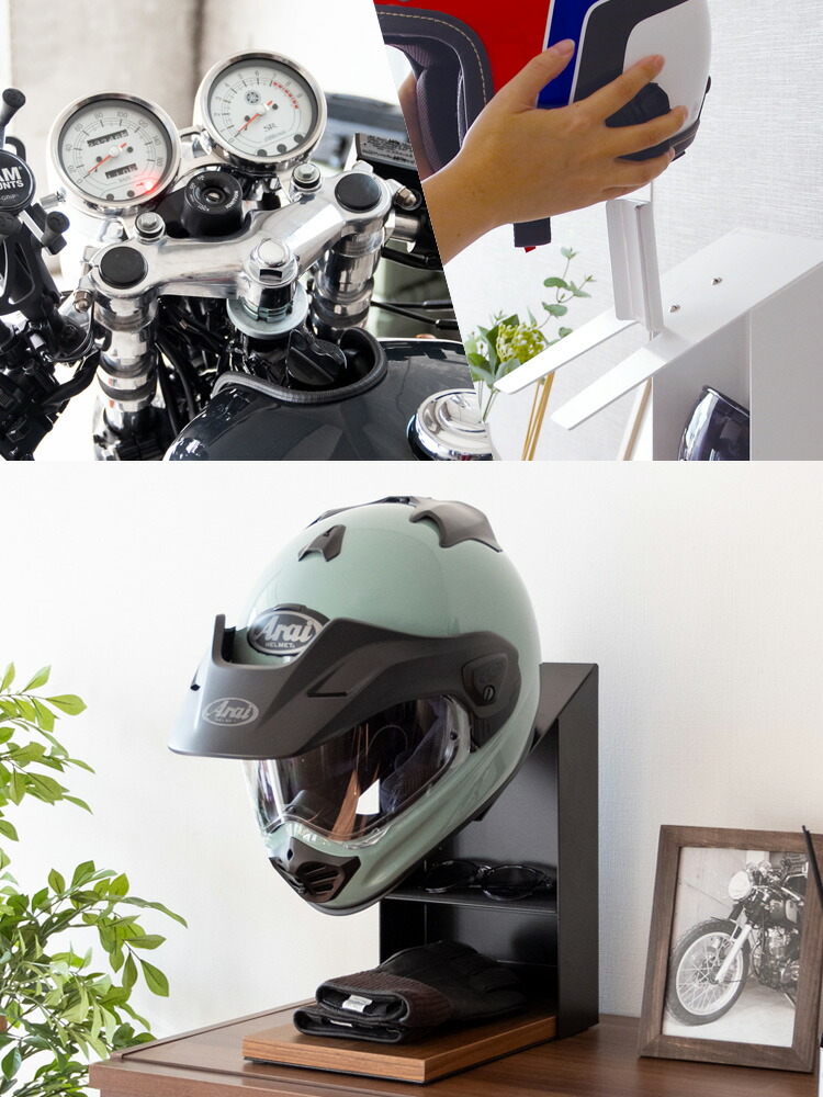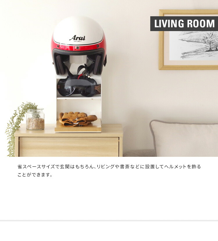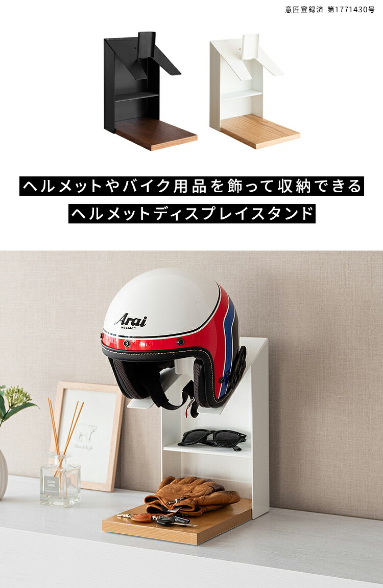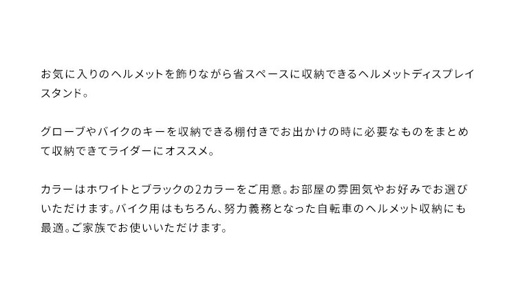 お気に入りのヘルメットを飾りながら省スペースに収納できるヘルメットディスプレイスタンド。グローブやバイクのキーを収納できる棚付きでお出かけの時に必要なものをまとめて収納できてライダーにオススメ。カラーはホワイトとブラックの2カラーをご用意。お部屋の雰囲気やお好みでお選びいただけます。バイク用はもちろん、努力義務となった自転車のヘルメット収納にも最適。ご家族でお使いいただけます。
