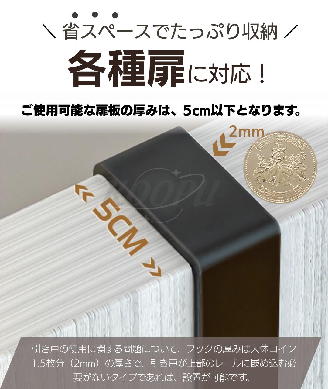 ・フックの厚みは大体コイン1.5枚分(2mm)の厚さで、引き戸が上部のレールに嵌め込む必要がないタイプであれば、設置が可能です。