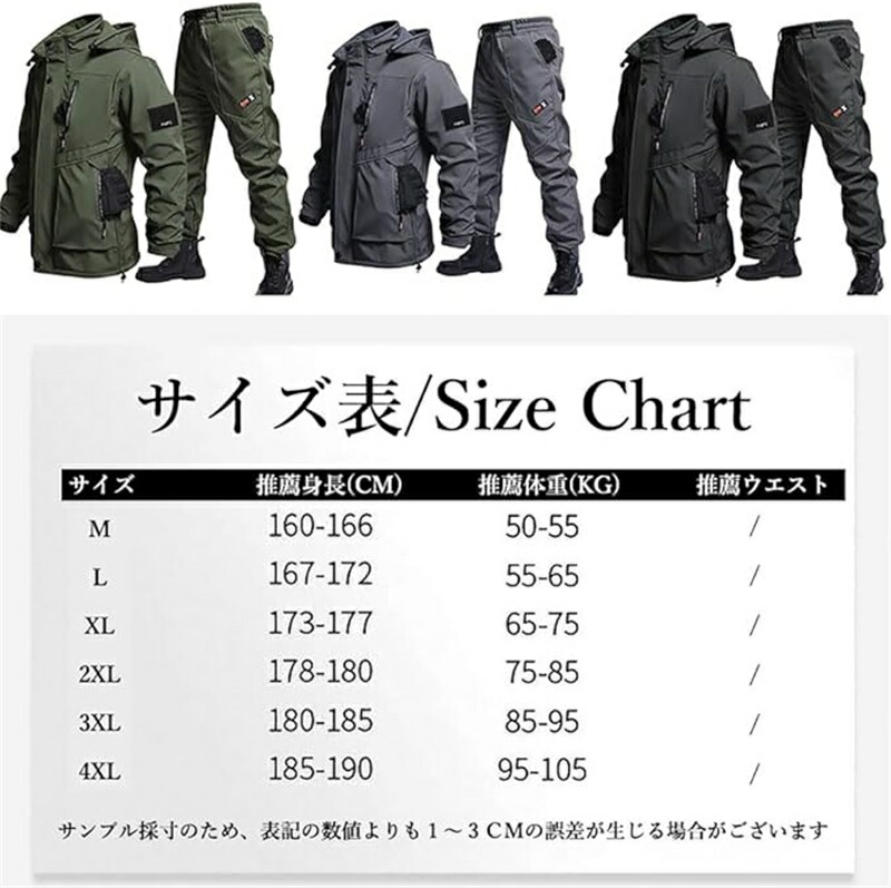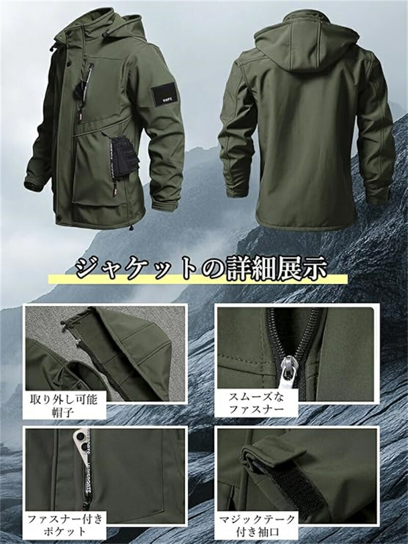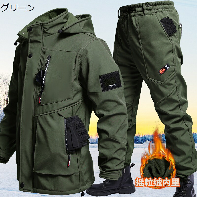 メンズ 冬用作業着セット 裏起毛 防風ジャケット 作業パンツ 長袖 フード付き 防水 防風 厚手 アウトドア バイク スキーなど適用 プラスサイズ 釣り