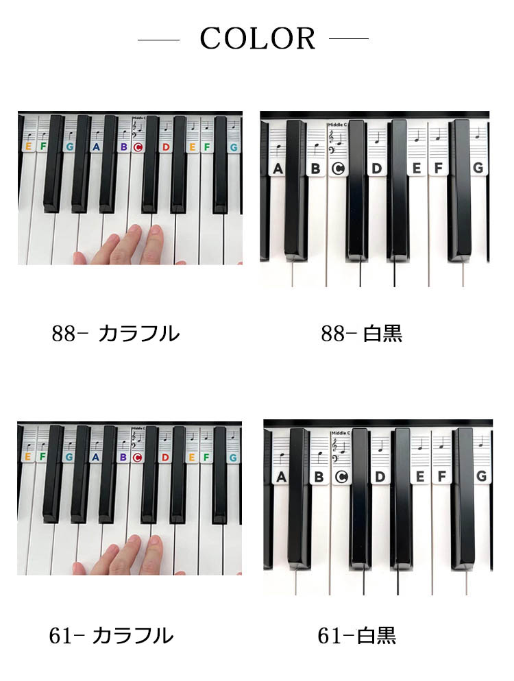 61 88 鍵盤対応 ピアノシール ピ 88-カラフル 88-白黒 61-カラフル 61-白黒