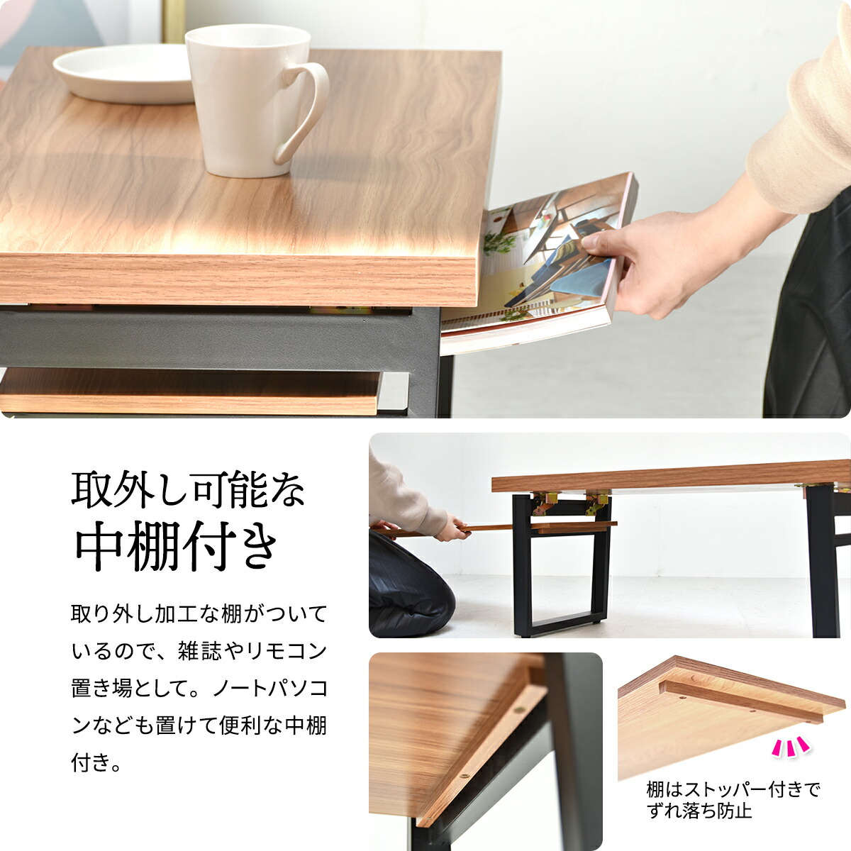 取り外し加工な棚がついているので、雑誌やリモコン置き場として。ノートパソコンなども置けて便利な中棚付き。