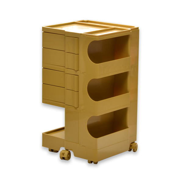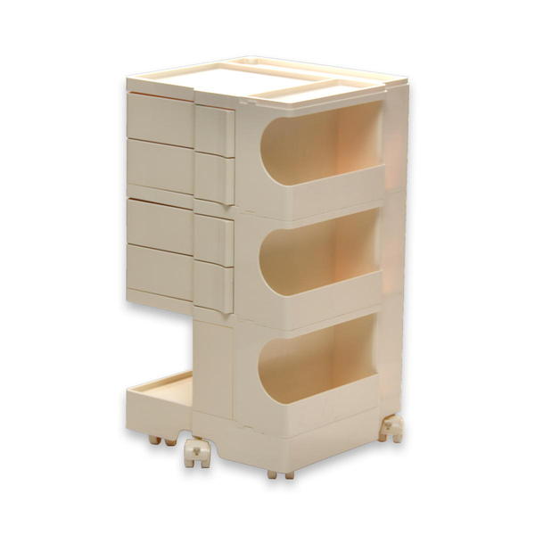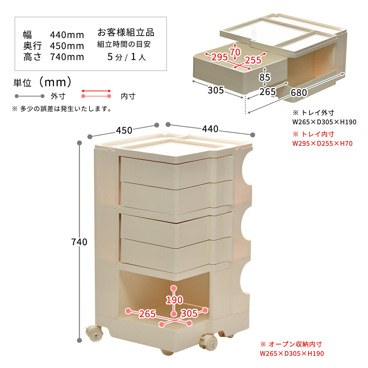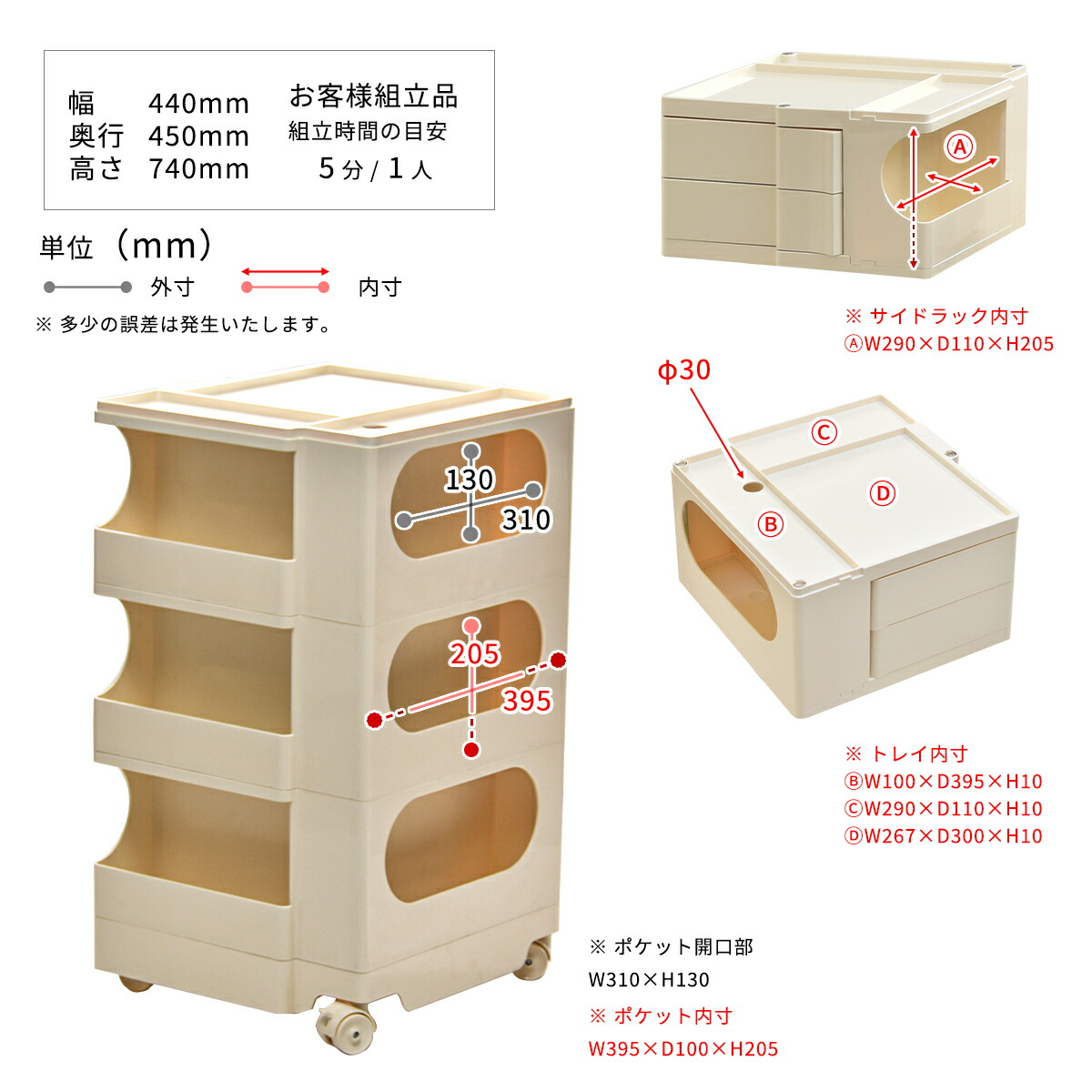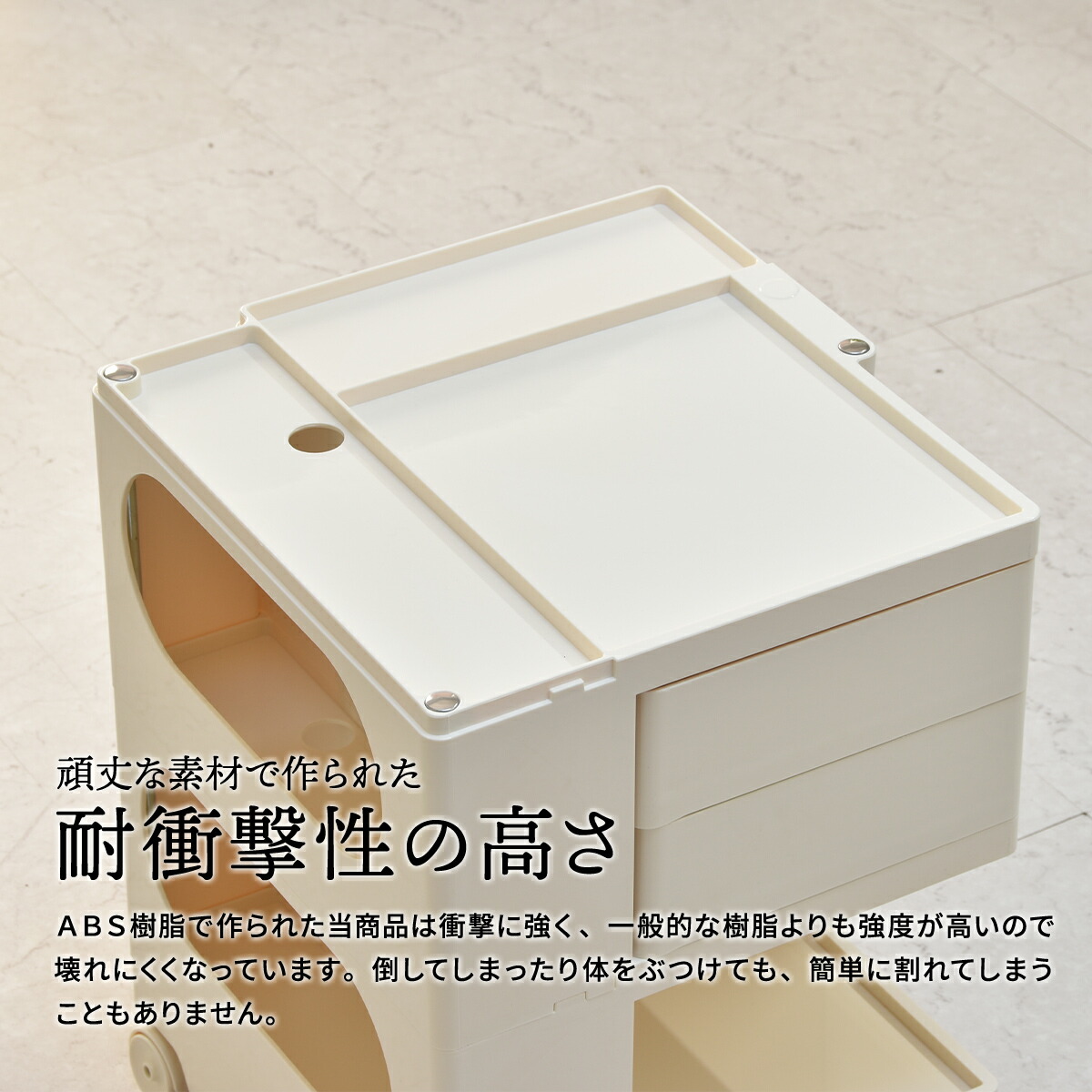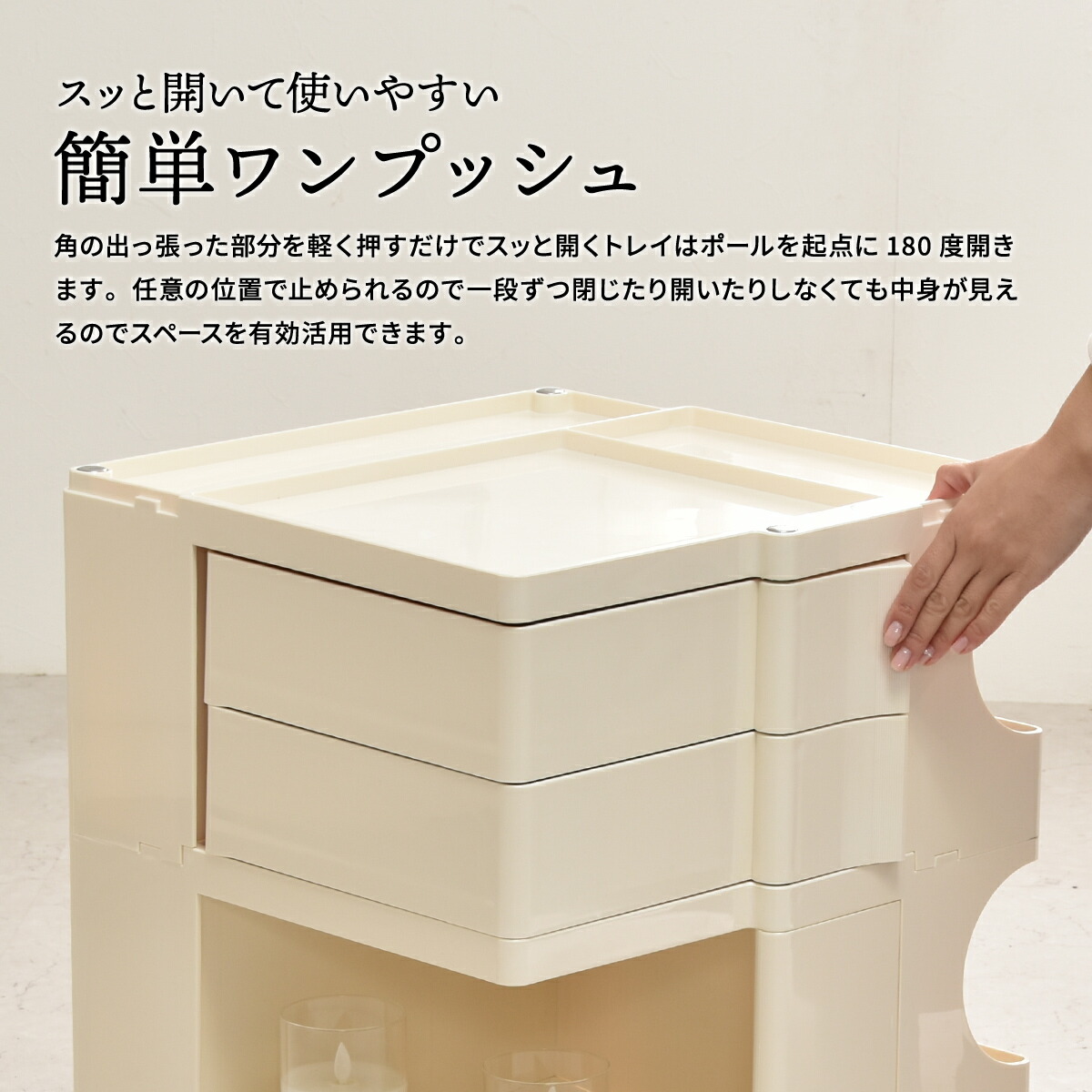 キャスター付きの本体を回転させることで側面4面すべてを効率的に使える、デザイン性と機能性に優れた収納家具です。180度回転するスライドトレイや、ボトル類の保管に適した奥行きのあるポケットなど、機能性に富んだ収納スペースが随所に工夫されています。4段タイプは、デスクサイドやキッチンでご使用いただくのに最適。一般的なデスクやテーブルとほぼ同じ高さなので、作業台としてもご使用いただけます。ABS樹脂製なので衝撃にも強く、汚れたときの拭き取りも簡単にお手入れができます。
