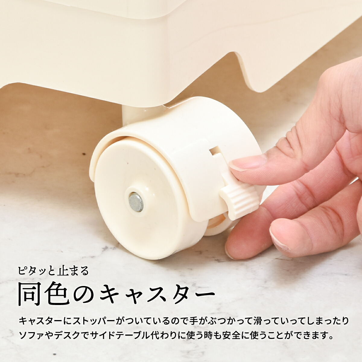 このタイプのワゴンでは黒や白のキャスターが多く、かわいらしい本体の色味から浮きがち。