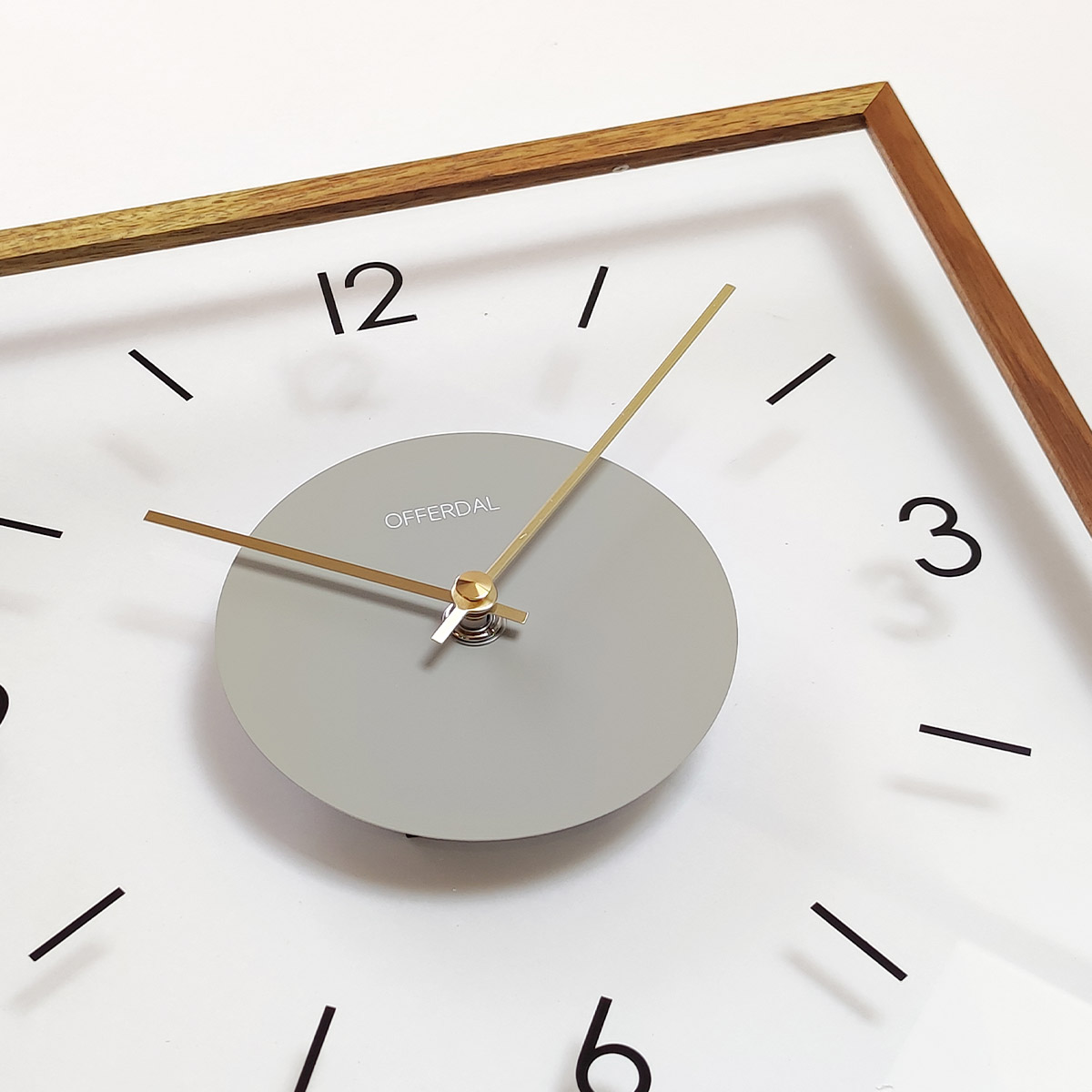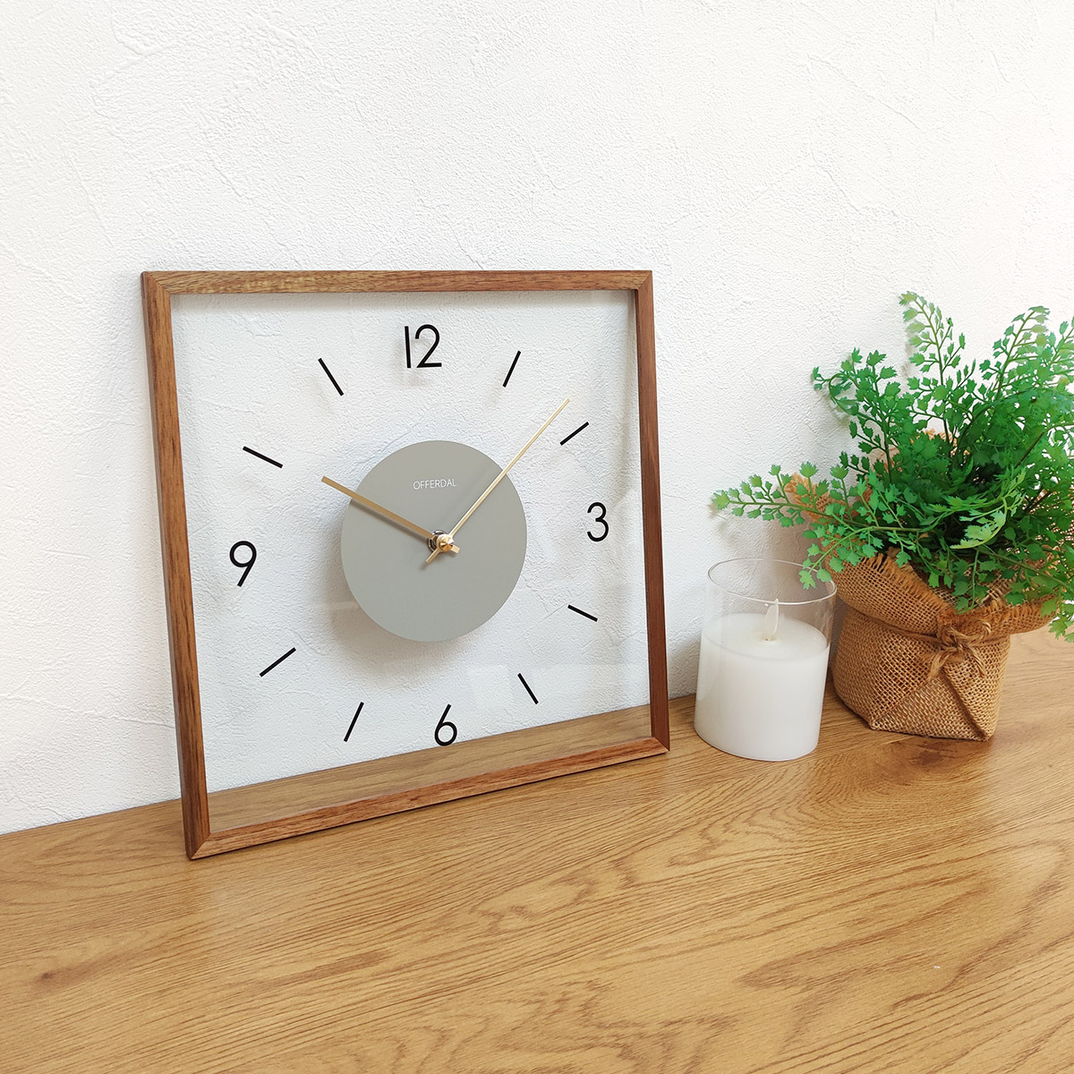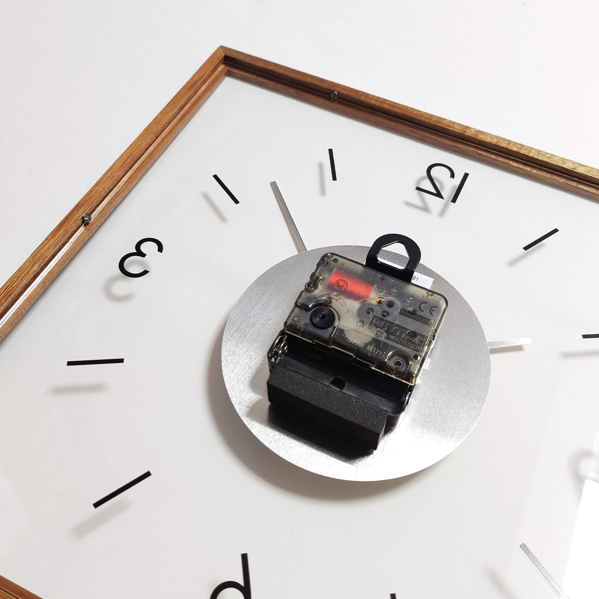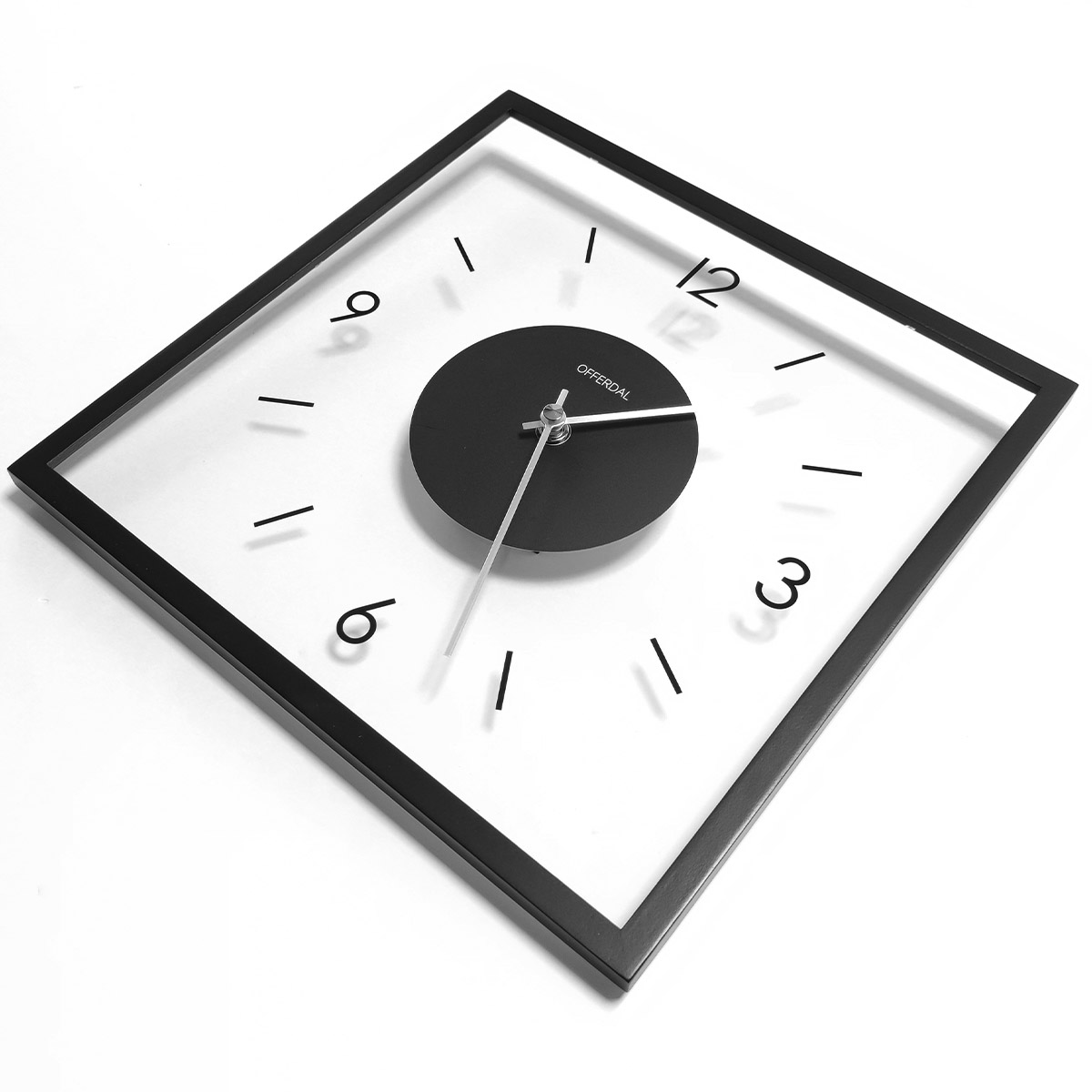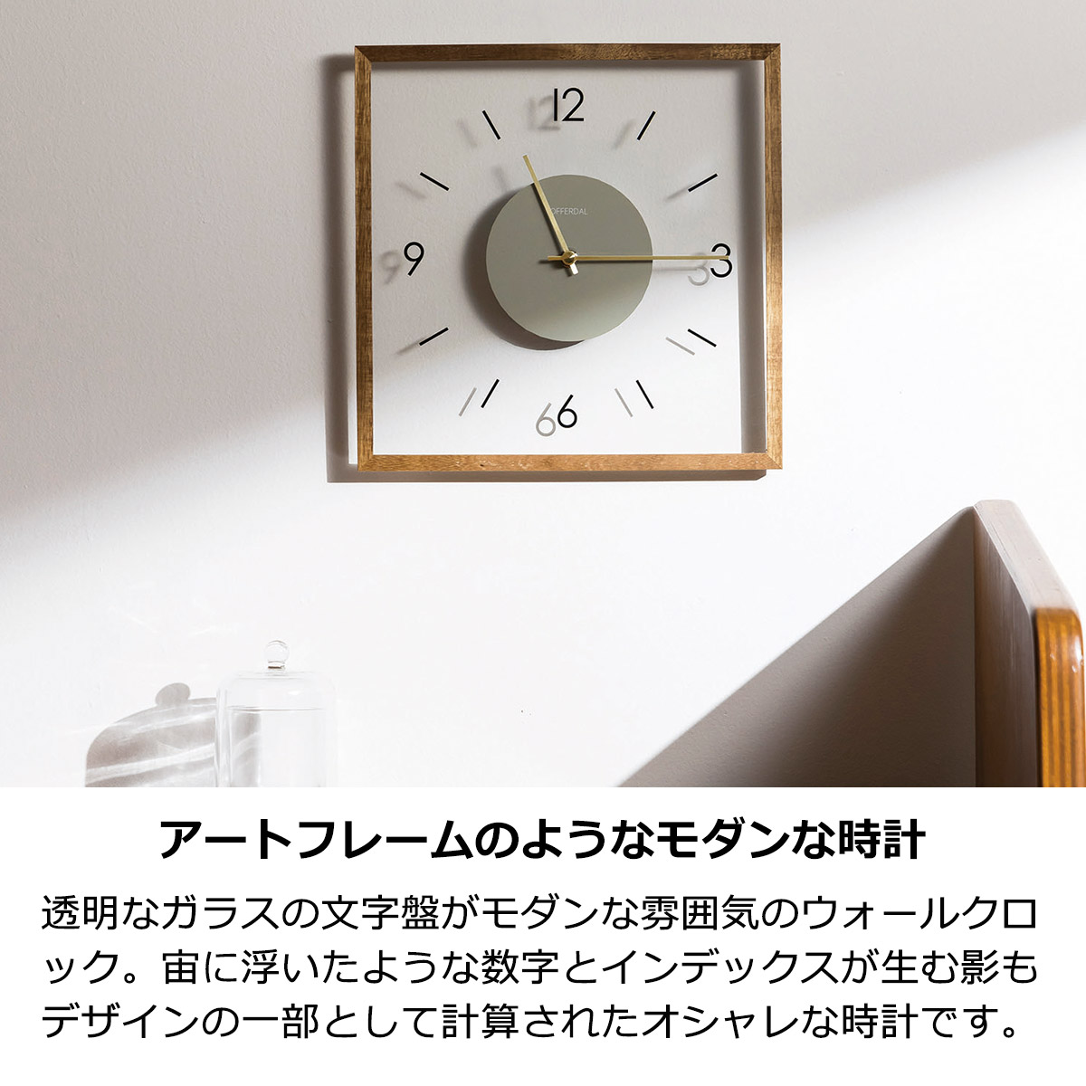 透明なガラス製の文字盤がモダンな雰囲気を宿したスクエアタイプのウォールクロック。わずか2.5cmのスリムな奥行きとポスターフレームのような細いウッドフレームが洗練された佇まいをより一層引き立てるモダンなデザインです。