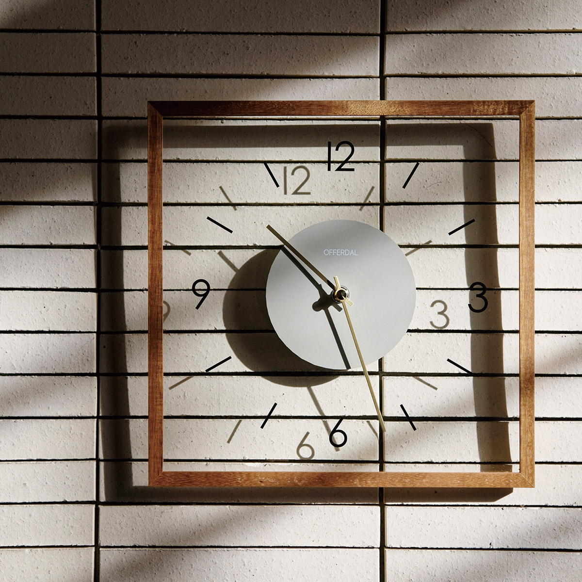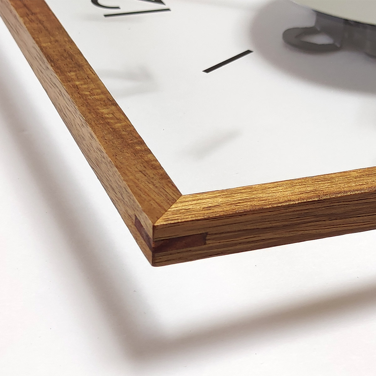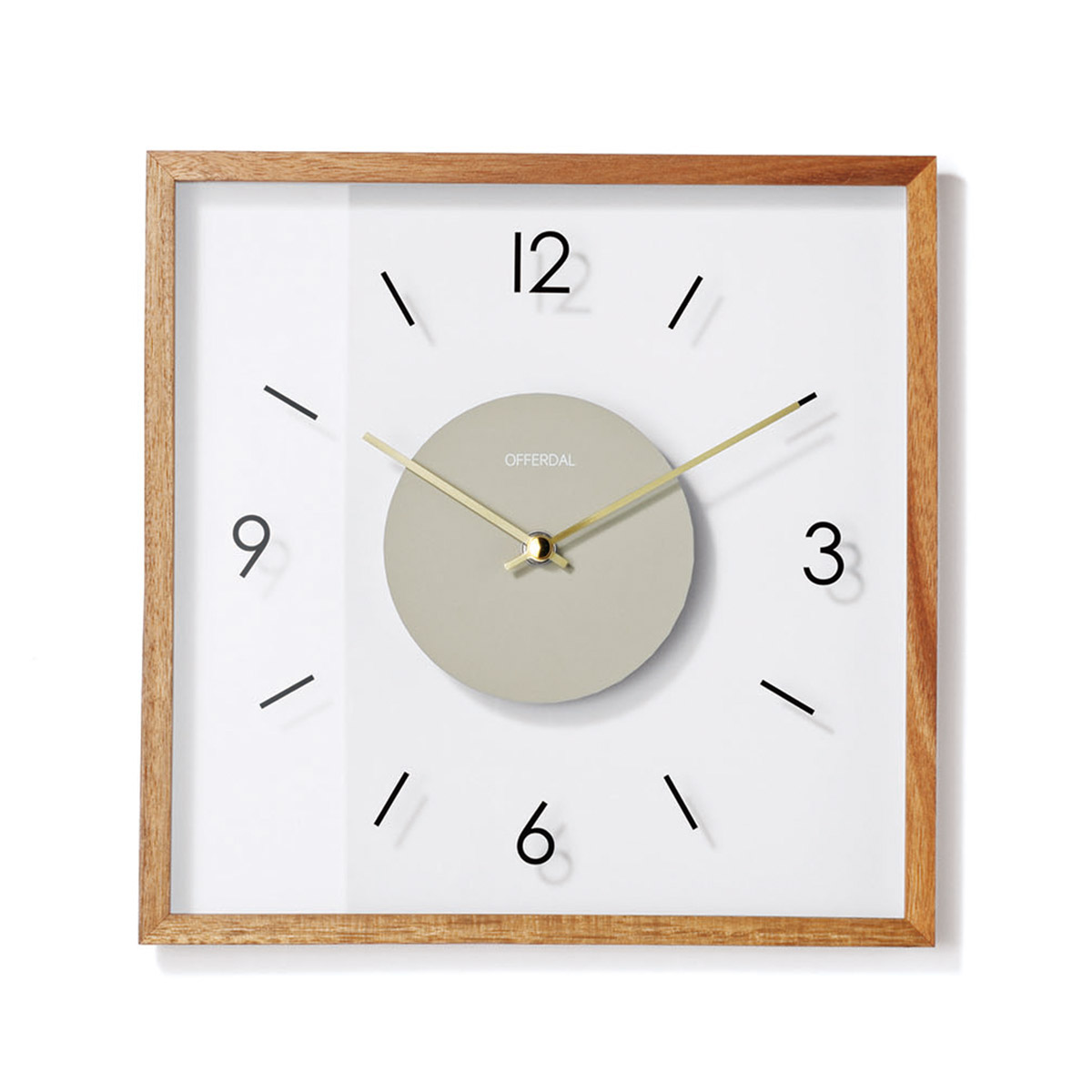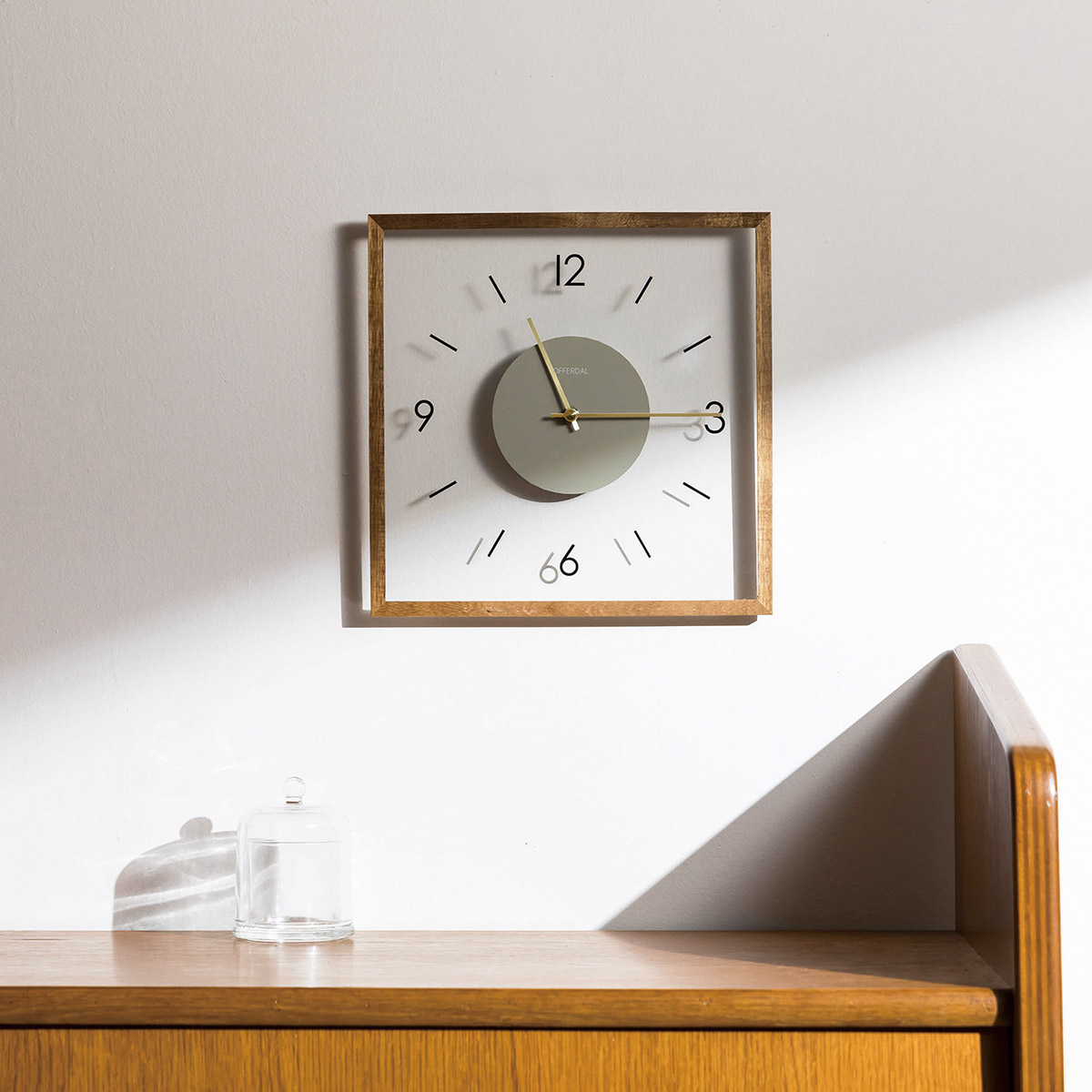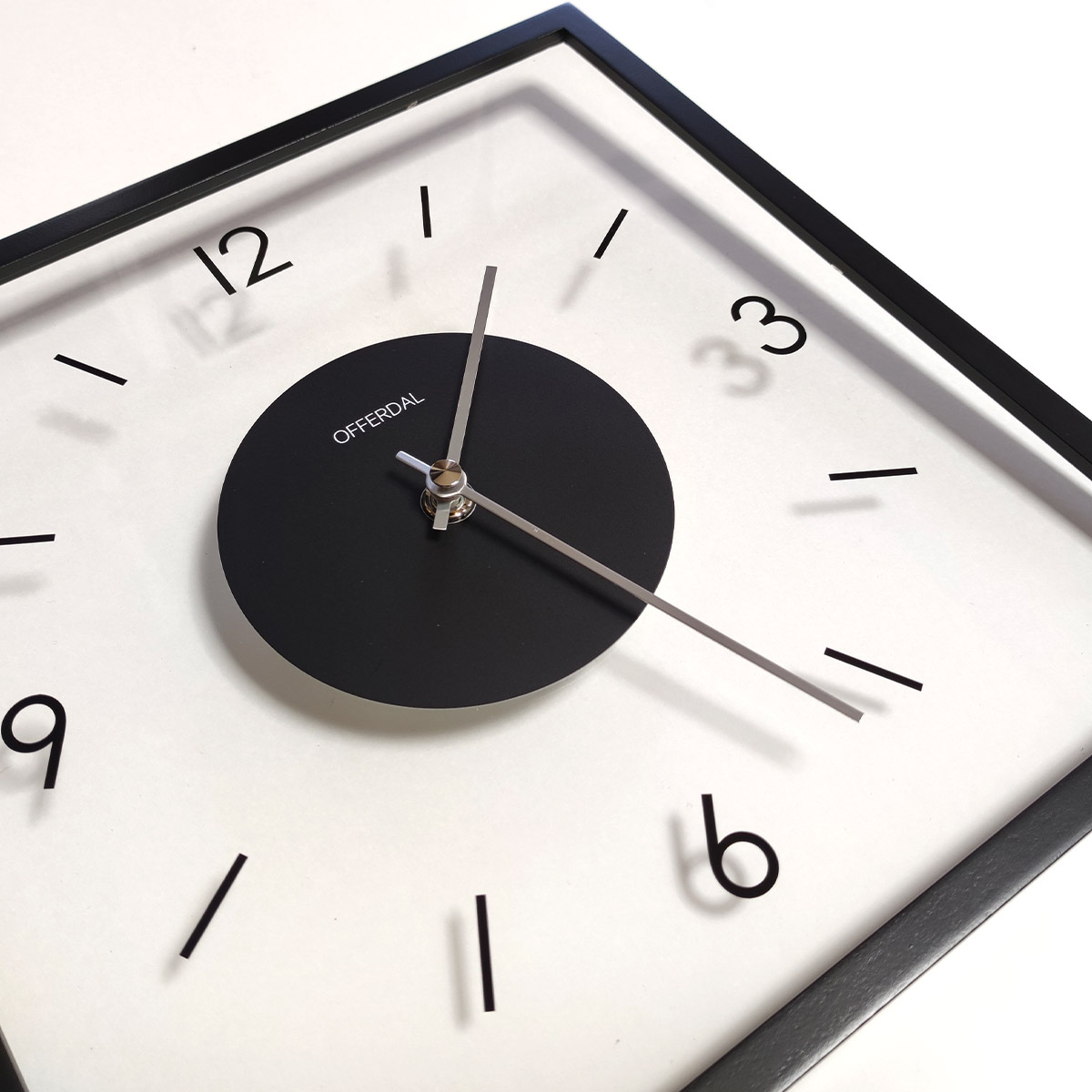 透明なガラス製の文字盤がモダンな雰囲気を宿したスクエアタイプのウォールクロック。わずか2.5cmのスリムな奥行きとポスターフレームのような細いウッドフレームが洗練された佇まいをより一層引き立てるモダンなデザインです。