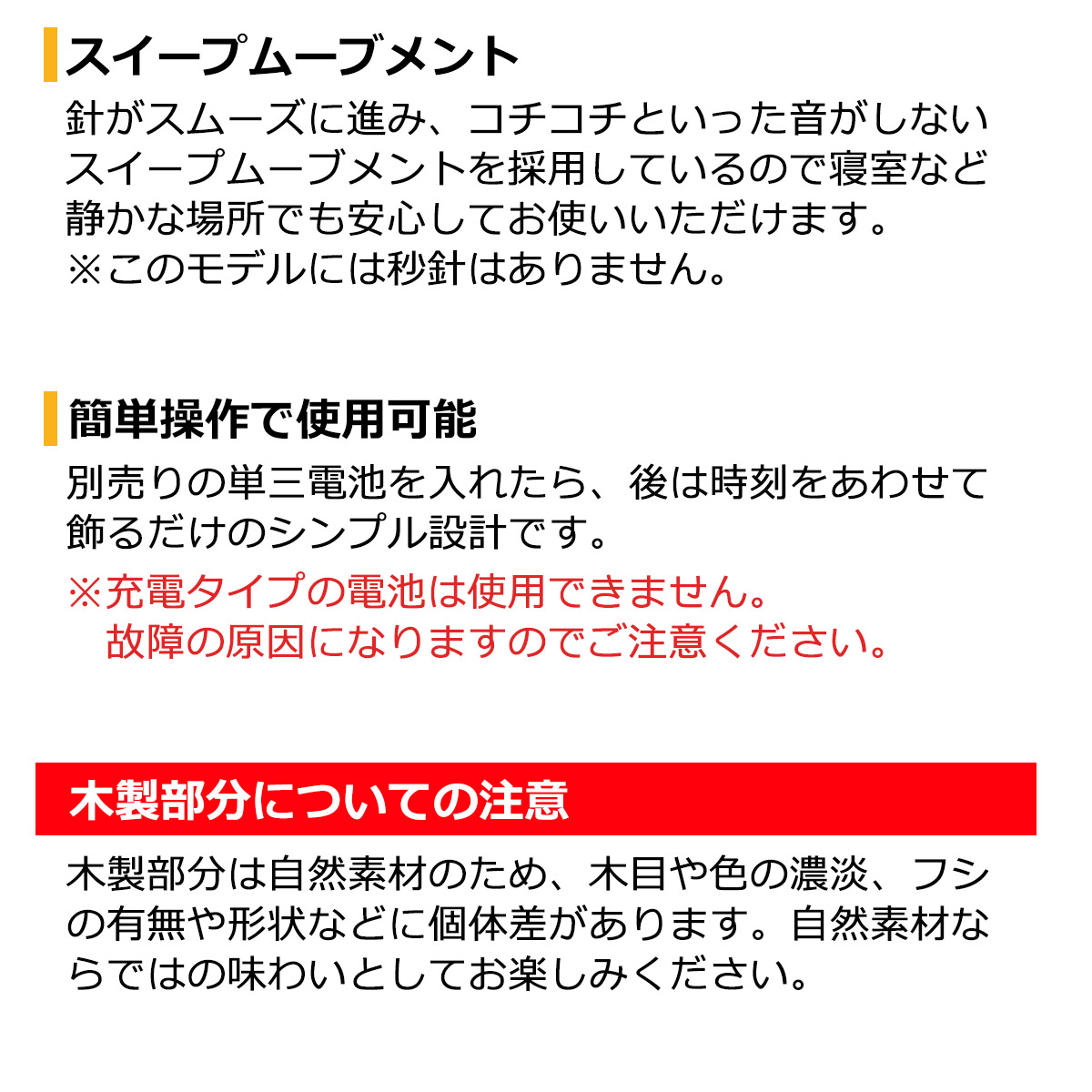 コチコチと音がしないスイープムーブメントを採用。寝室や書斎など静かな場所での使用もオススメです。※秒針はありません。