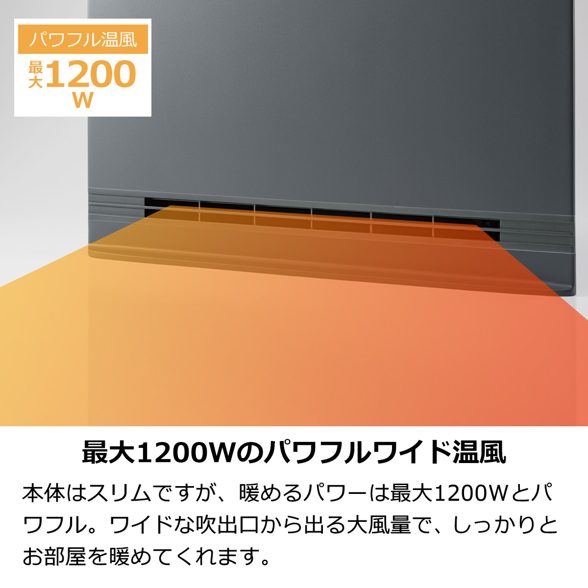 本体は薄型スリムですが、暖めるパワーは最大1200Wとパワフル。ワイドな吹出口から出る大風量で、しっかりとお部屋を暖めてくれます。