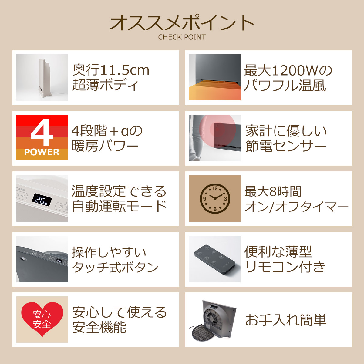 一定時間経過後に電源をオン/オフするタイマーも1~8時間(1時間単位)で設定可能。起床前にお部屋を暖めておく時や就寝時に便利です。
