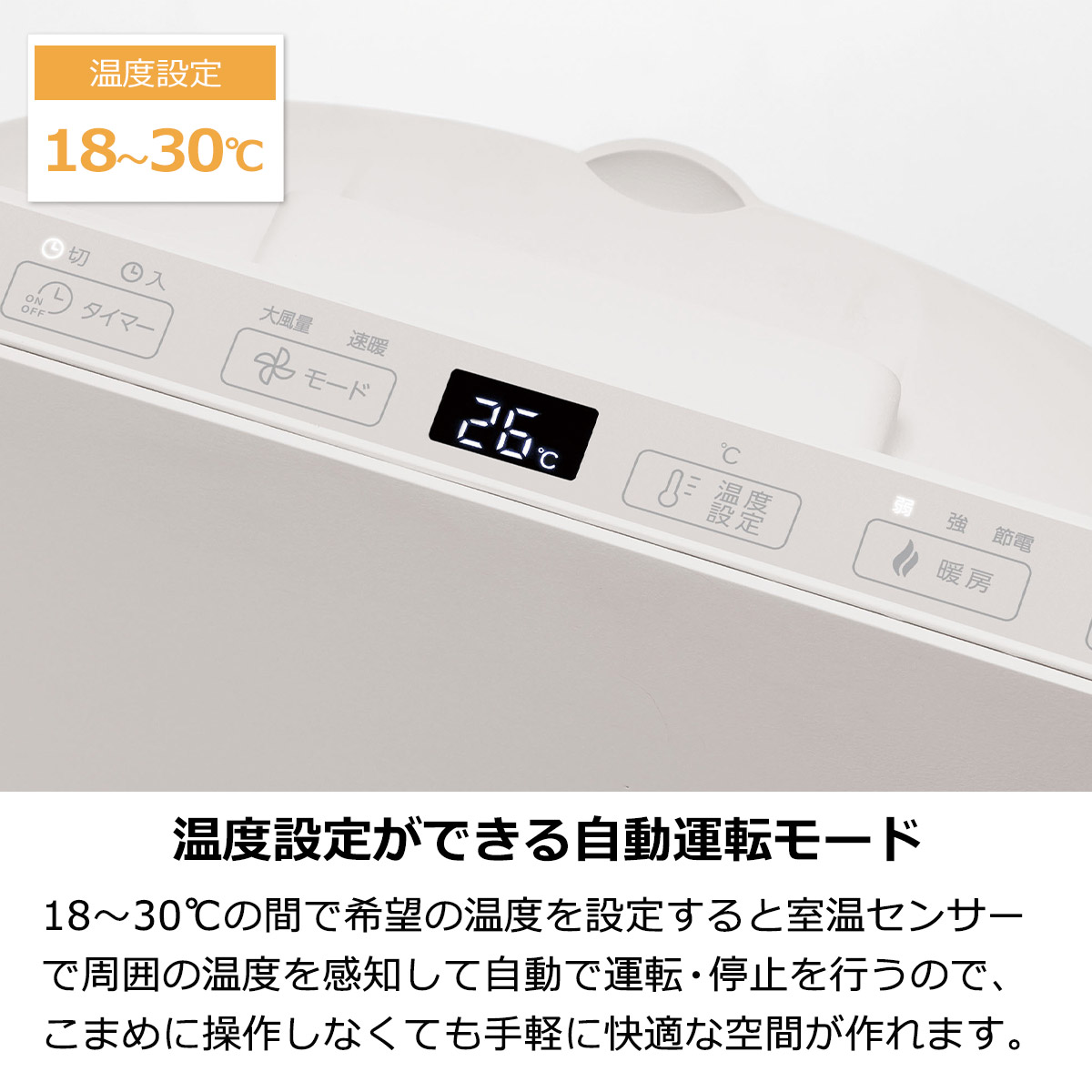 18~30℃の間で希望の温度を設定すると室温センサーで周囲の温度を感知して自動で運転・停止を行うので、こまめに操作しなくても手軽に快適な空間が作れます。