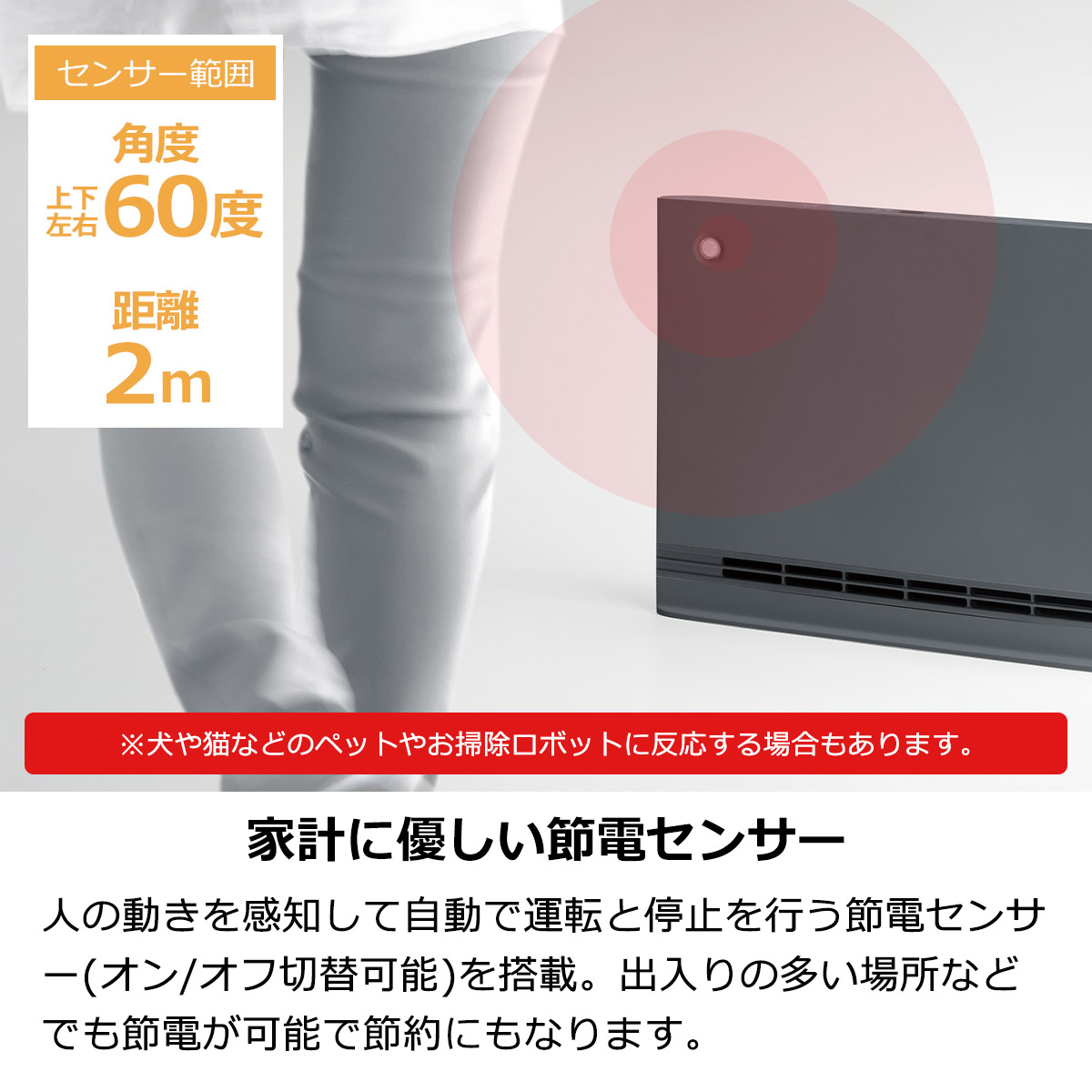 人の動きを感知して自動で運転と停止を行う節電センサー(オン/オフ切替可能)を搭載。出入りの多い場所などでも節電が可能で節約にもなります。