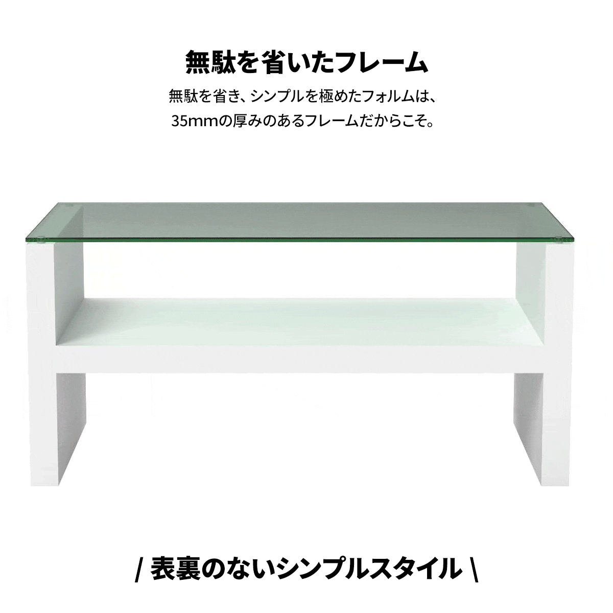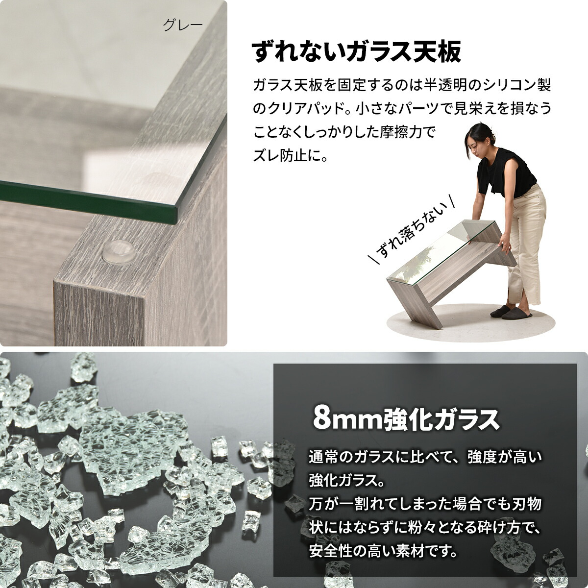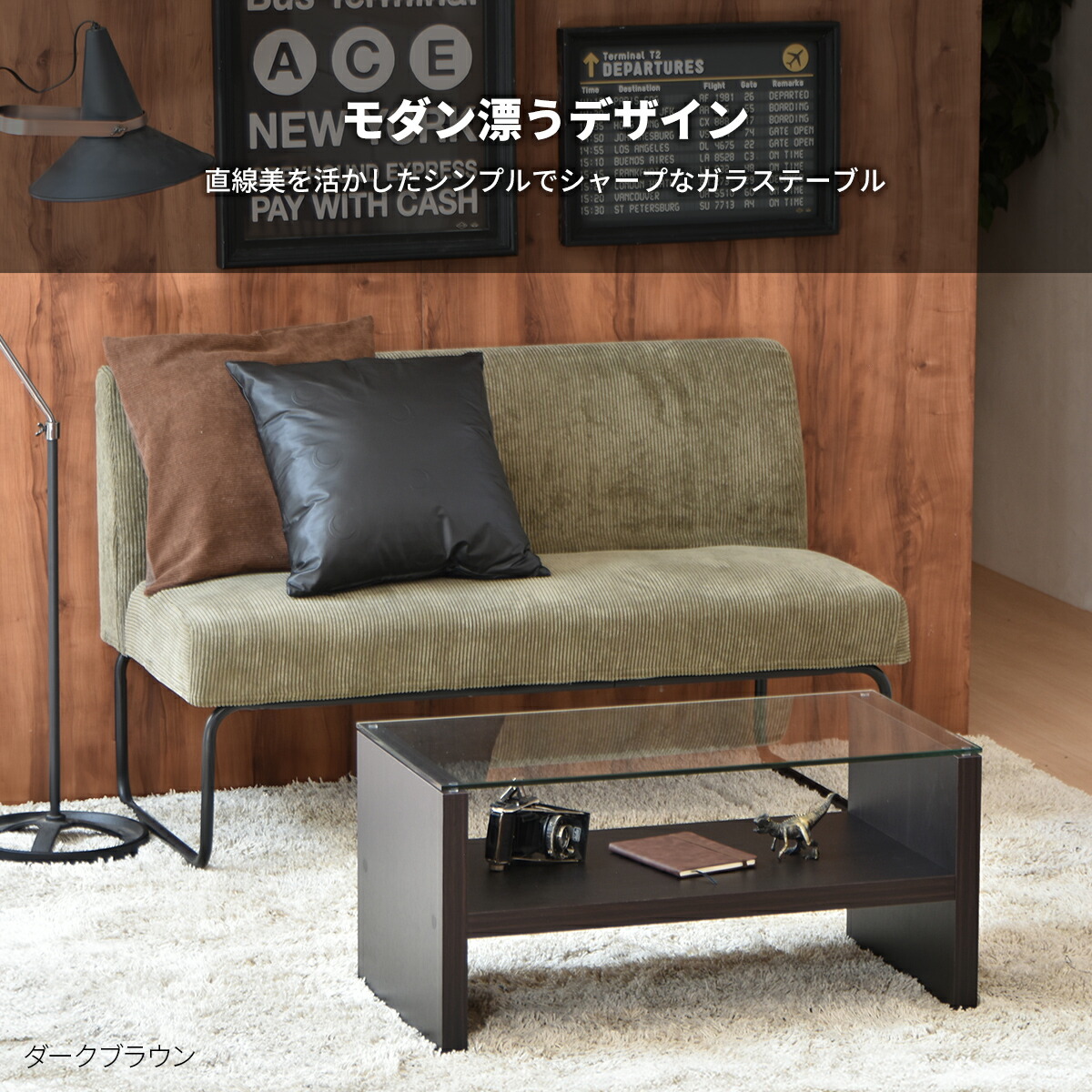直線美をいかしたシンプルでシャープなガラステーブル。美しい木目の質感とガラス天板で、手軽に雰囲気のある空間を演出します。シンプルでシャープなデザインなので場所を選ばず、洋室はもちろん和室でも使用しても、違和感なくその場所に馴染みます。もう一つの大きな魅力は、クリアガラスの天板と、35mmのしっかりとした棚板。棚板にお気に入りの小物やアクセサリーを置いて、ディスプレイテーブルとしても。