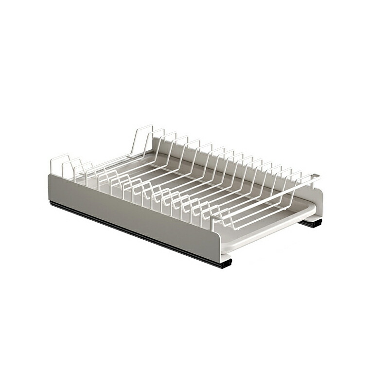 スライドラックの底部には水受けトレイが設計され、洗ったばかりの食器はそのまま入れて水切りできます。