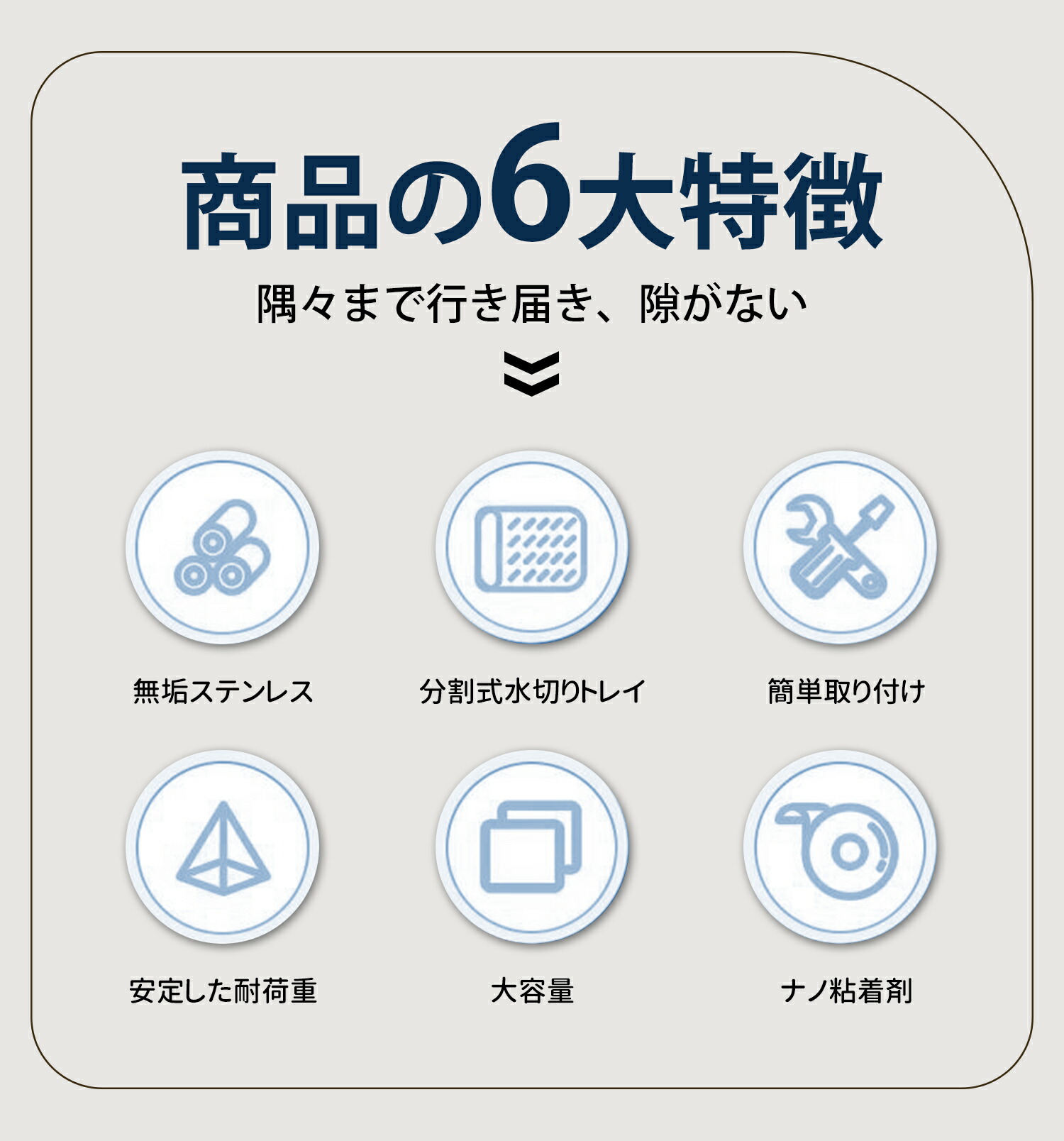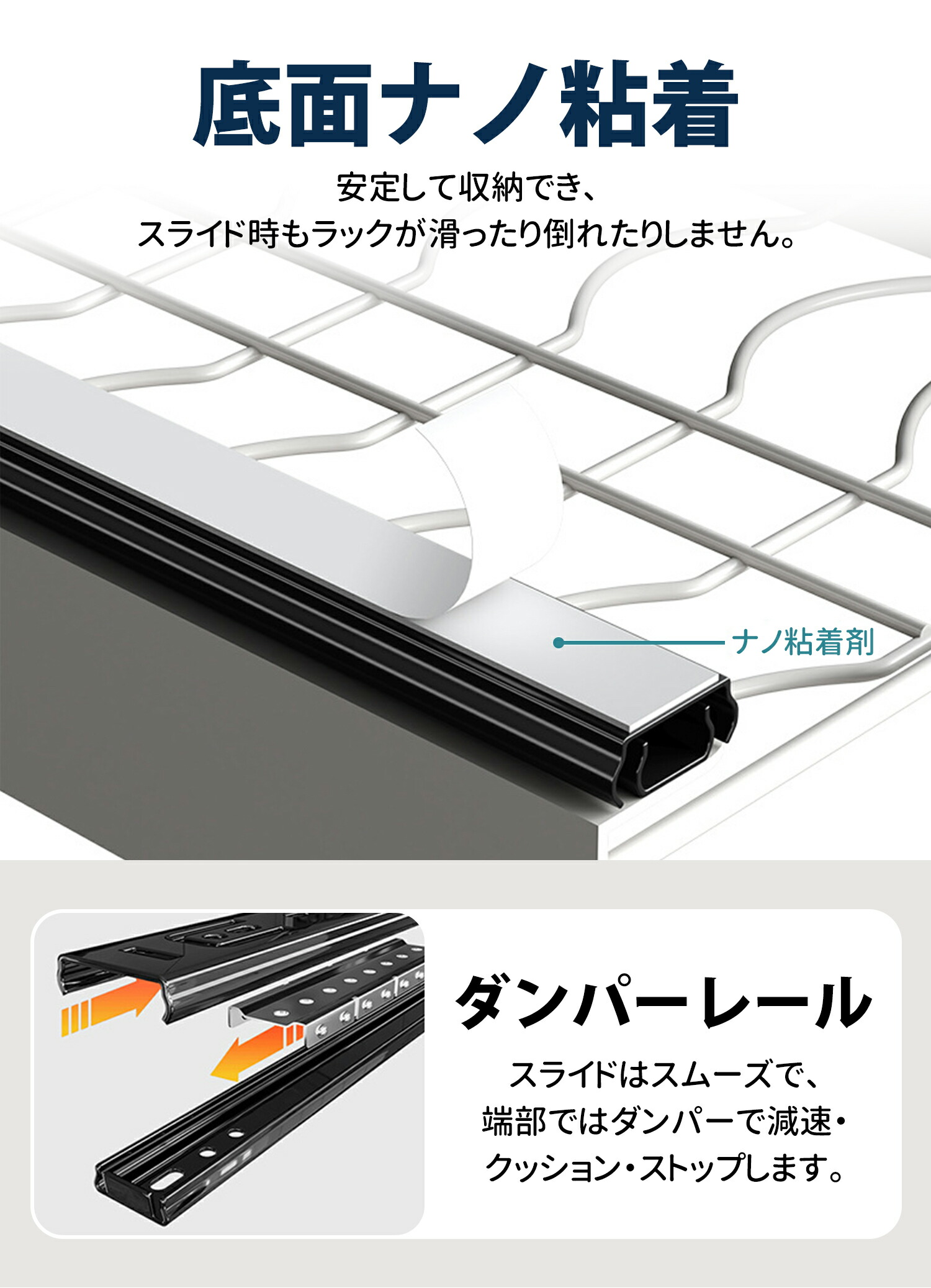 底面に滑り止めのナノ粘着テープが付いているので、揺れを防ぎ、食器の置いても引き出しでも安心。