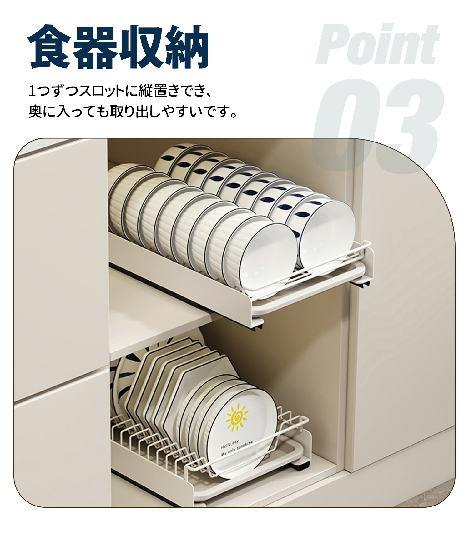 ボウルタイプは18個、プレートタイプは10個を収納できます。家族3 ~ 5人でも、気軽に食器を収納できる理想の収納棚です。