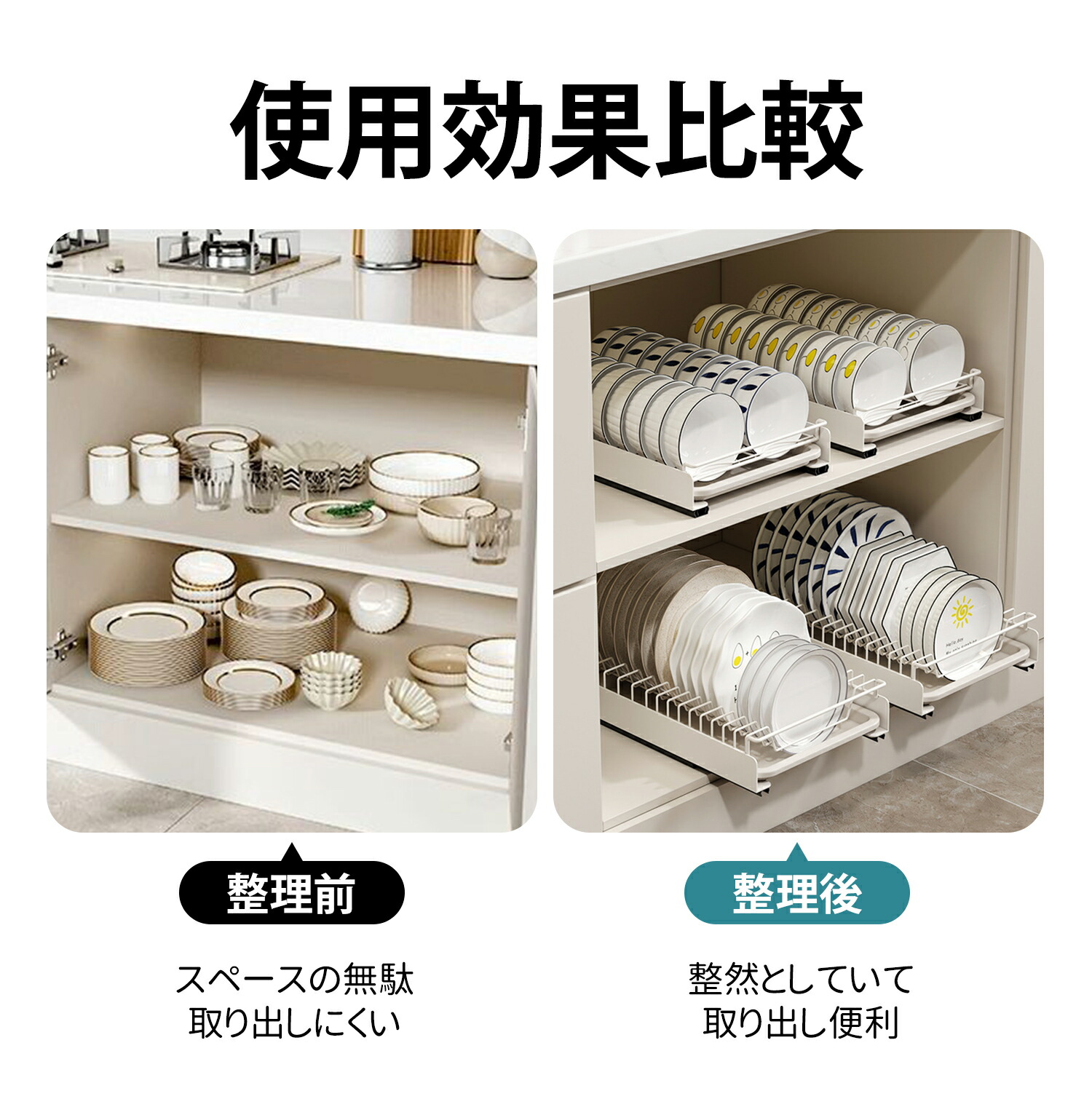ボウルとプレートを立ててきっちんと収納して、取り出しやすいと共に、スペースを最大限に有効活用できます。