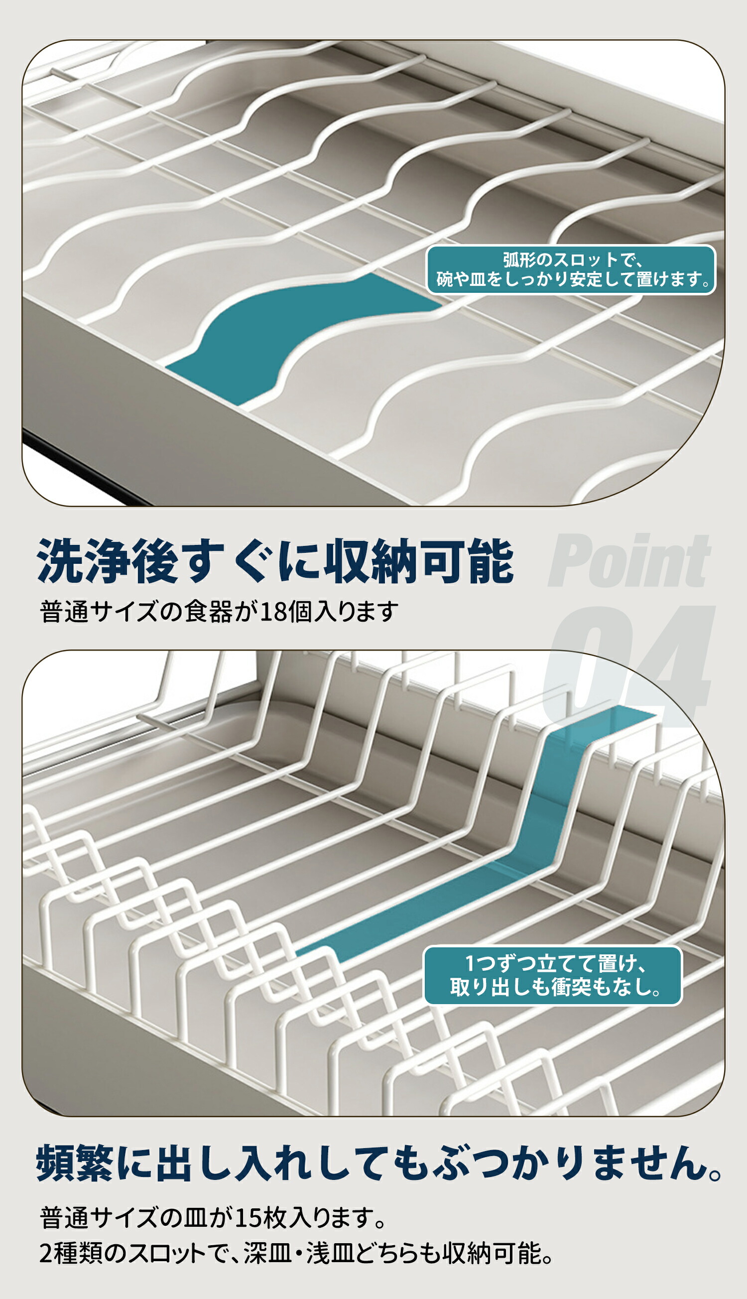 底に水受けトレーが付いているので、洗ったばかりの食器はそのまま入れて水切りでき、受け皿も自由に取り外せるので衛生面も安心。