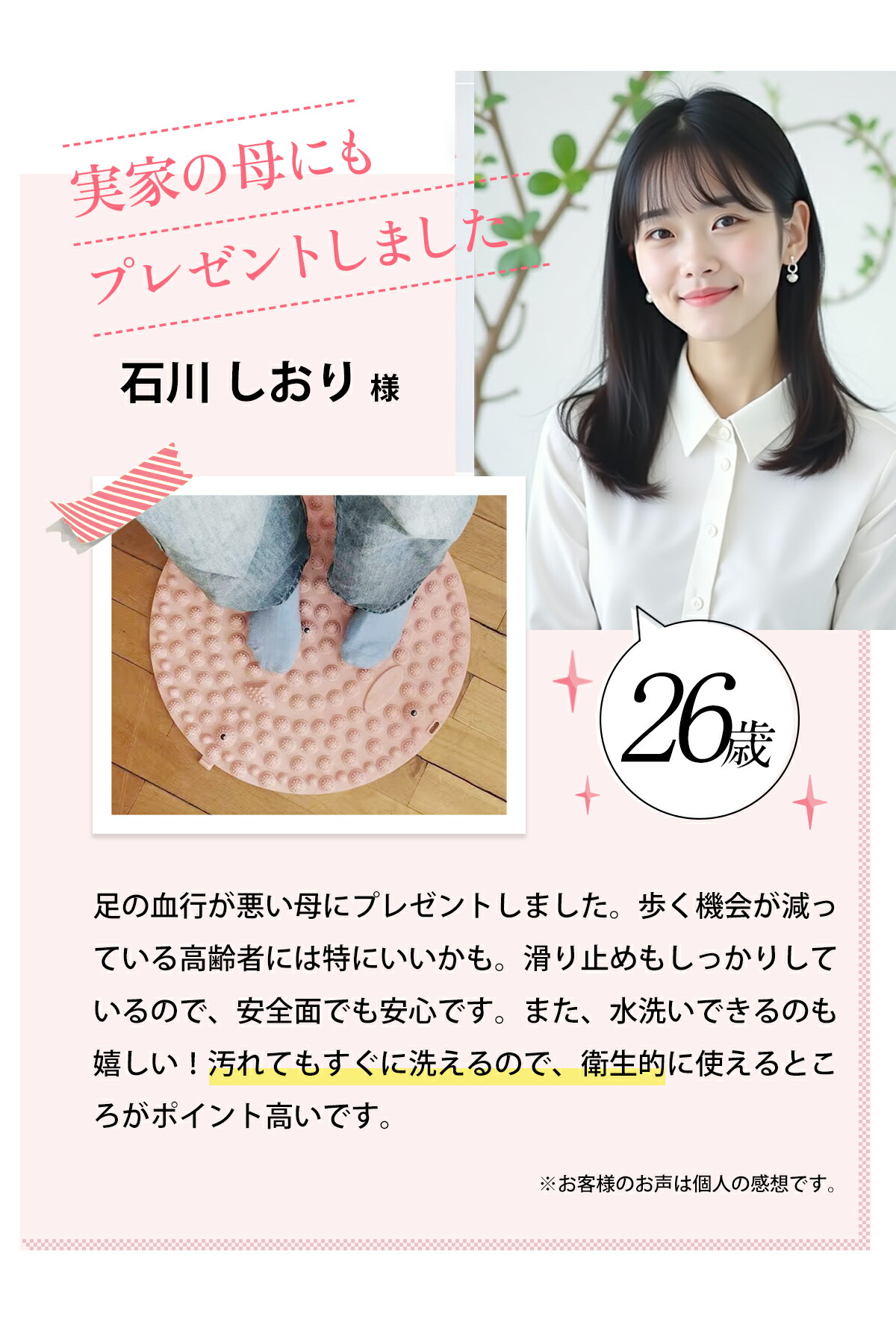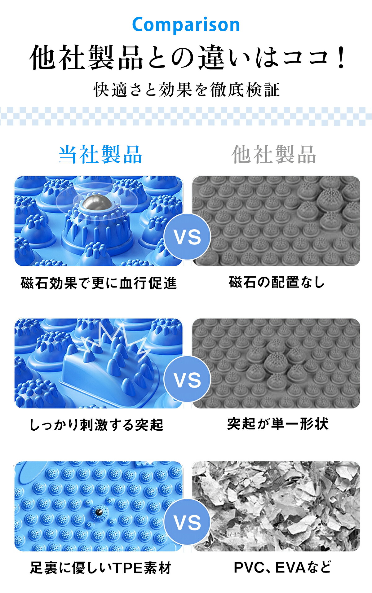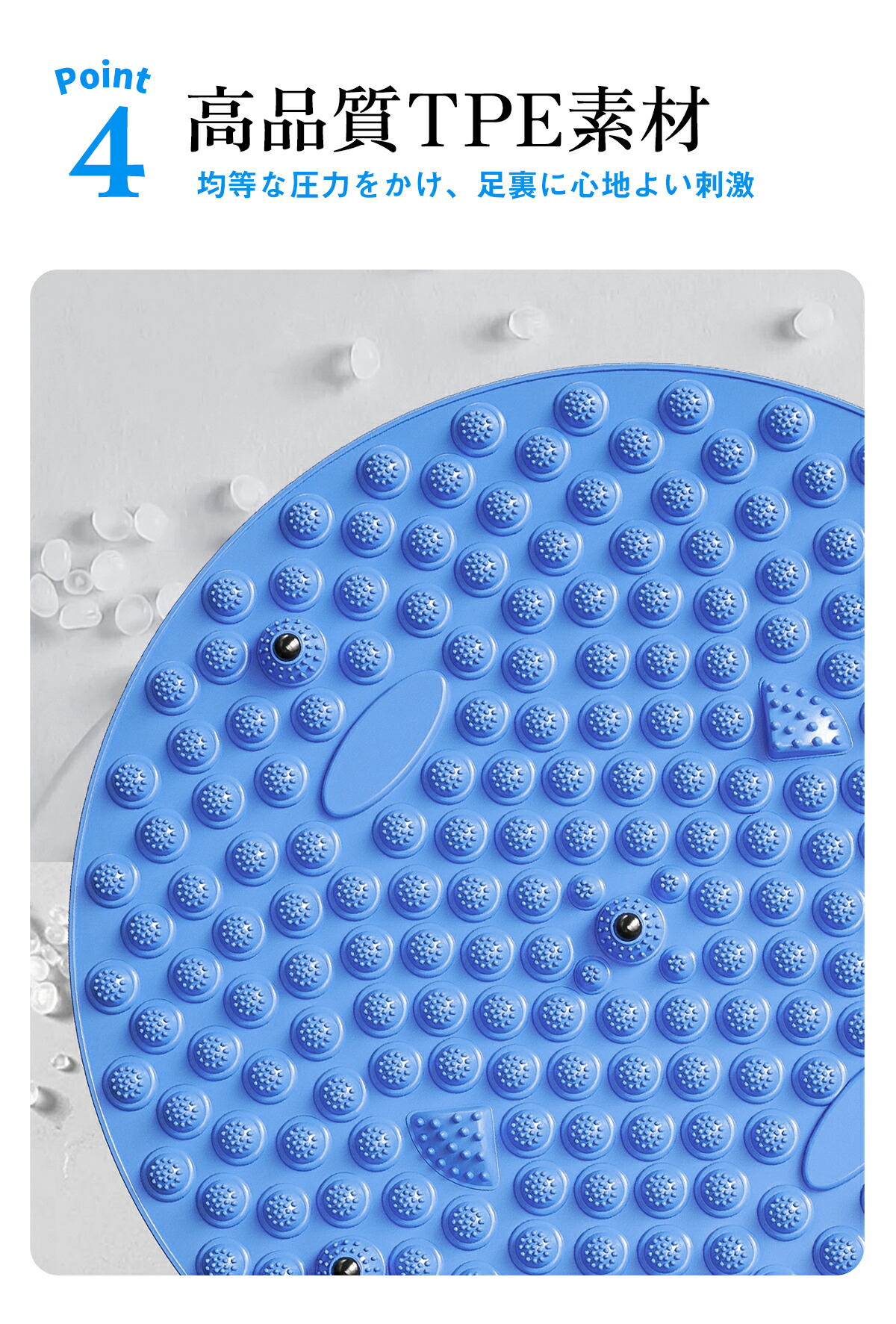 足を乗せて体重をかけるだけ、踏み込む度にツボをググッと刺激できる足ツボマット。マットにある突起の高さにより、足裏の反射区を簡単に刺激して、血行を良くし健康を促進します!
