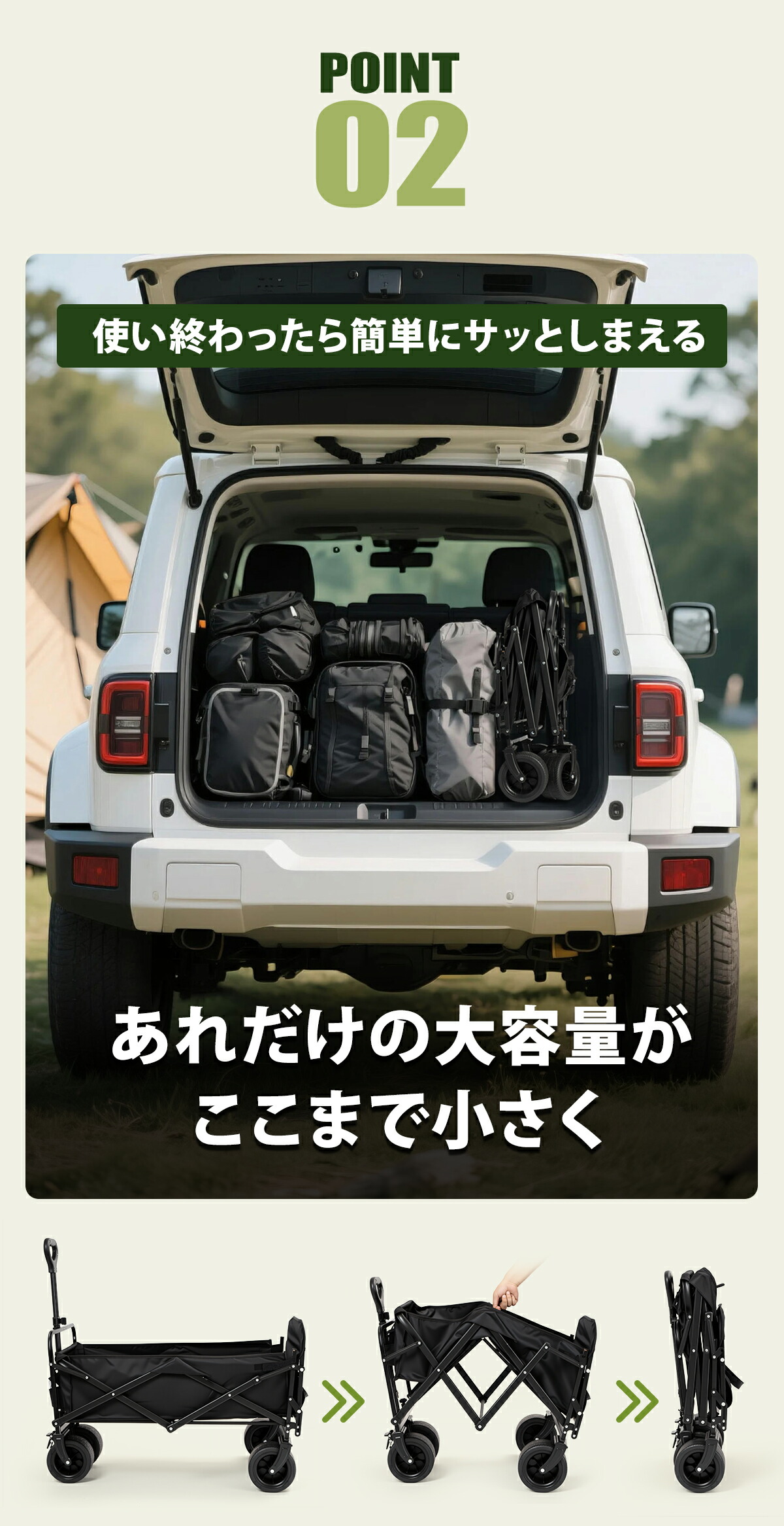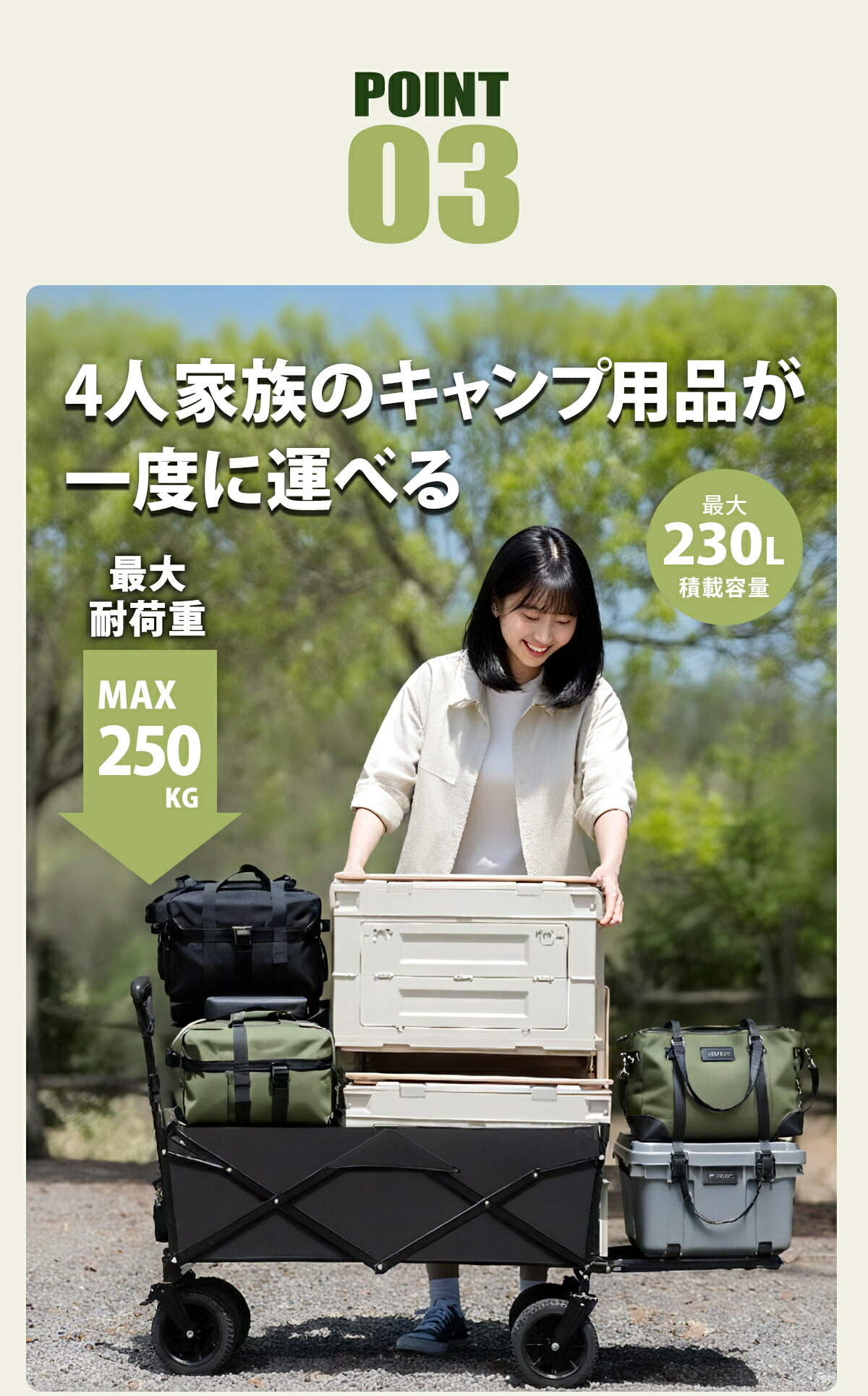 一般的なワゴンの約3倍にあたる「最大300L」の大容量設計で、家族全員分のキャンプ道具を一度に運ぶことが可能。何度も車とサイトを往復する必要がありません。