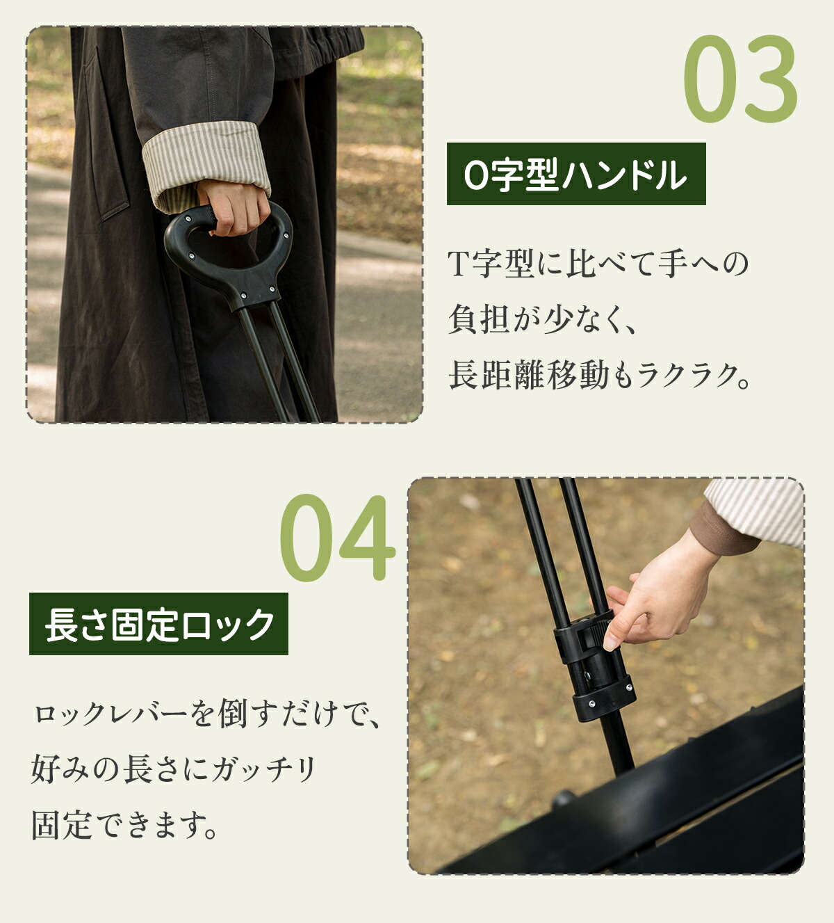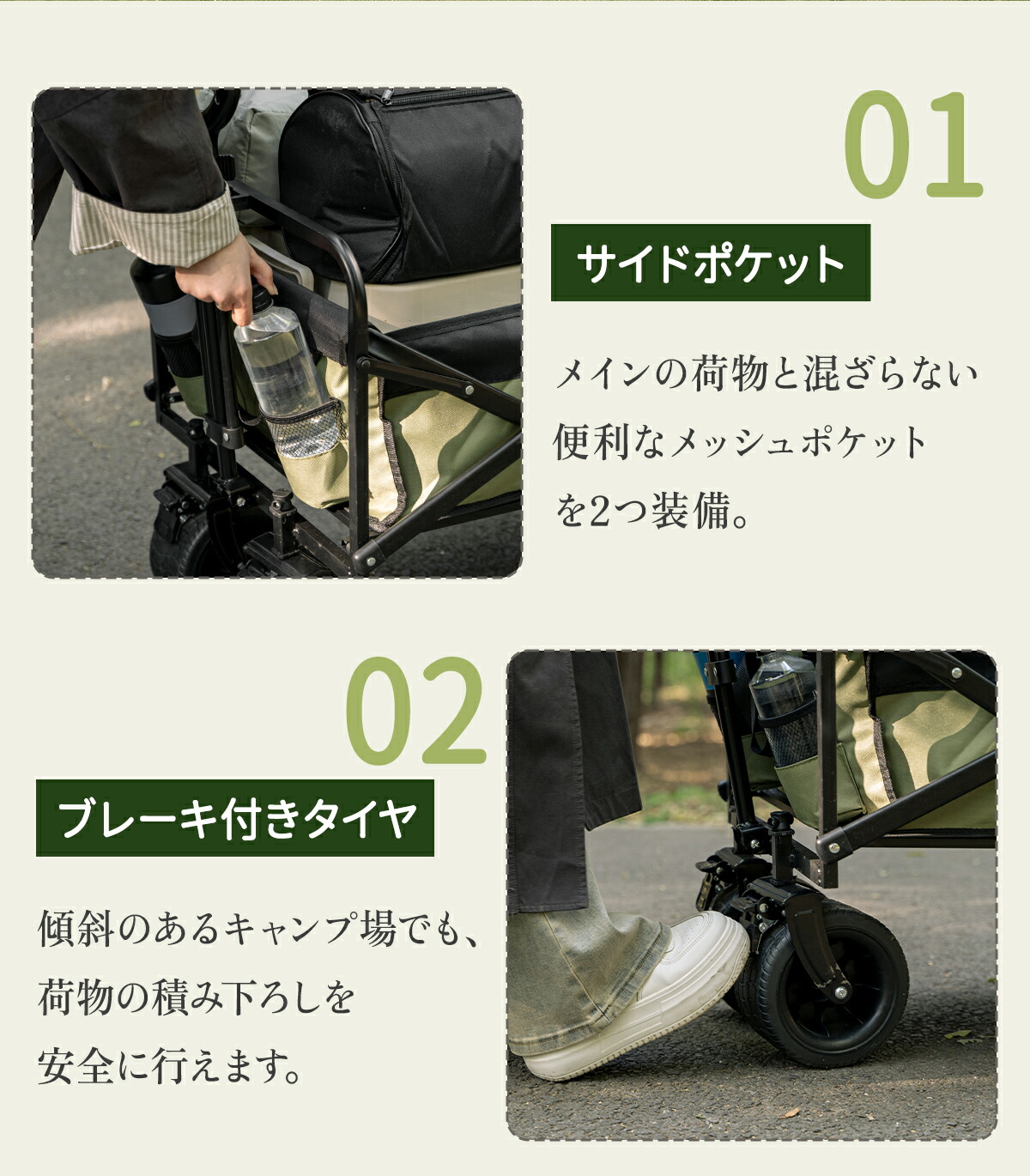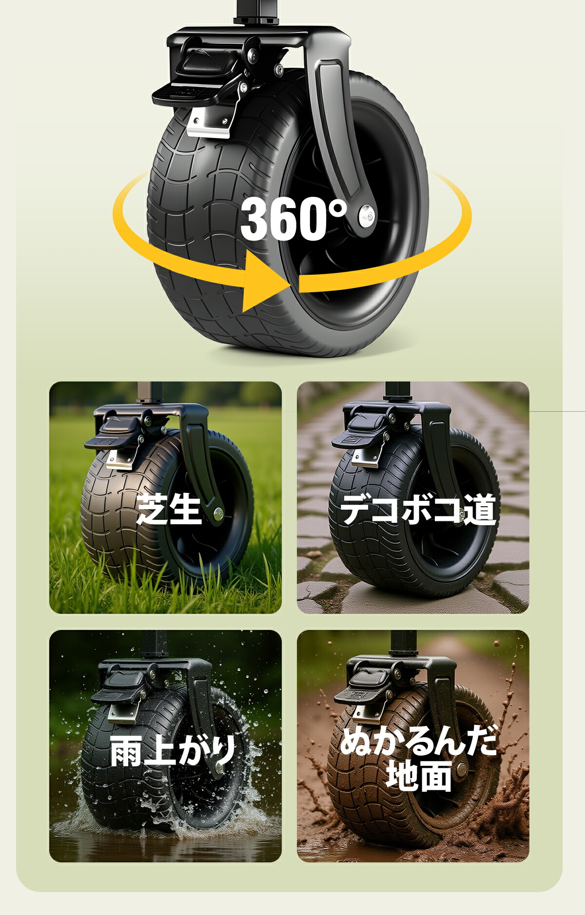 砂利道や芝生でも埋まりにくい大型ワイドタイヤを採用。前輪は360度回転するので小回りも抜群です。さらにストッパー(ブレーキ)付きで、傾斜のある場所でも勝手に転がらず安全に固定できます。