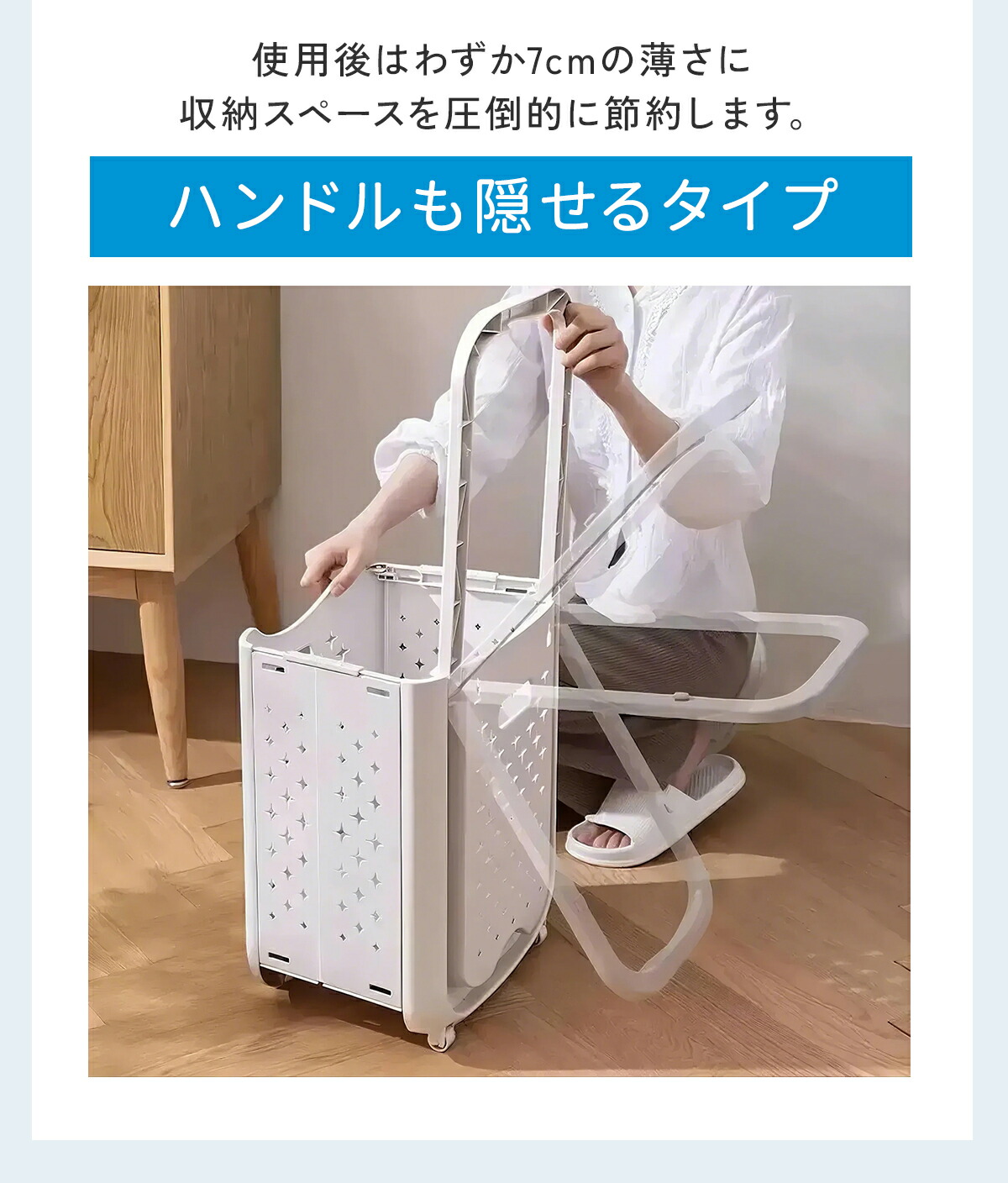 工具など一切不要!便利な折りたたみ式で、畳んだ時の厚さわずか7cm!ハンドルも背面にすっぽり収まり。収納スペースを気にすることなく隙間でも置けます。小さな家でも快適に暮らします。