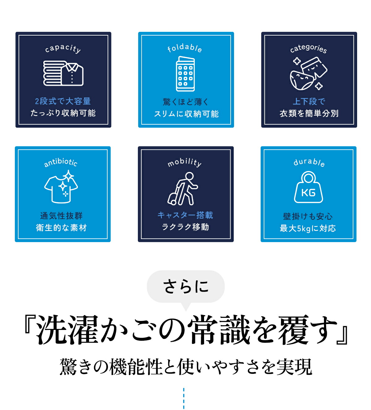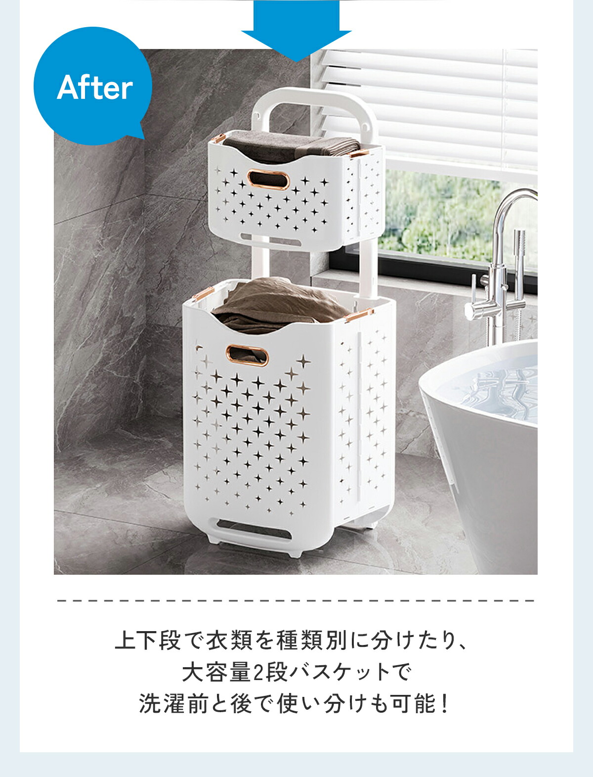 洗濯物を分別することができる2段式大容量のバスケットです。2つのバスケットが縦に配置されているため省スペースし、洗濯機に入る前に衣類の種類や色、汚れ具合など分別して収めることで、洗濯作業がスムーズになります!
