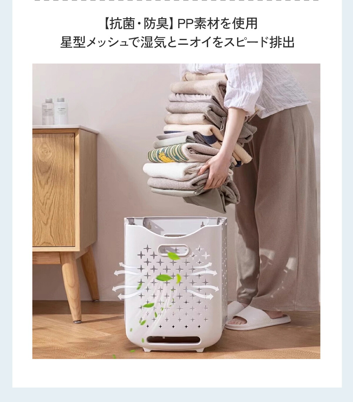 抗菌性と防臭性に優れた高品質のPP素材を使用する上、メッシュ構造で通気性が高く、衣類がカビやニオイの原因になることを防ぎます。可愛い星柄のデザインで、自宅内の雰囲気を損なわずに使用可能。