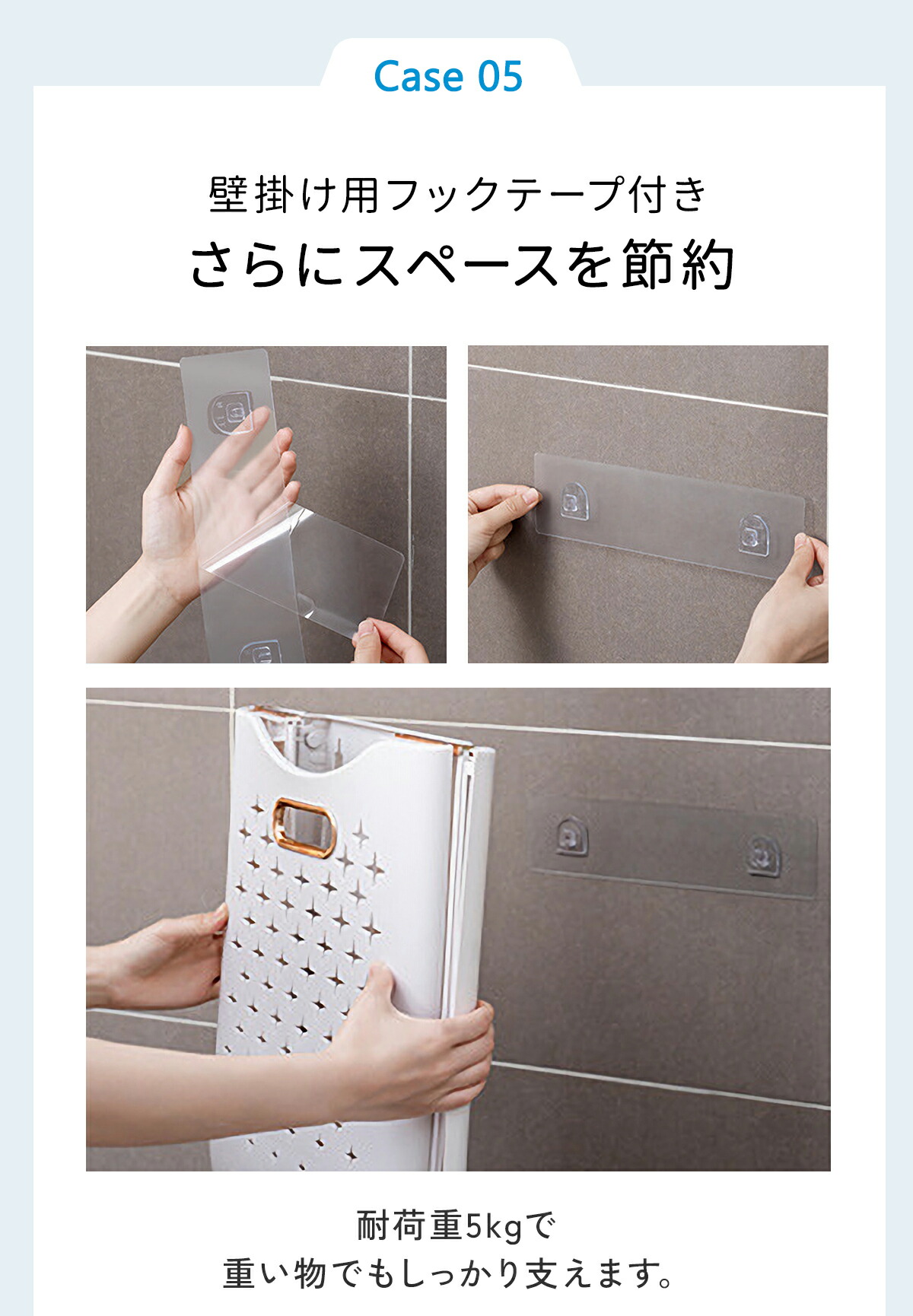 壁掛け用フックテープが付属します。粘着力は強力で5kgまでの負荷に耐えられます。狭いスペースでも邪魔にならないし、床掃除もラクです!