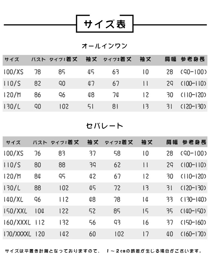 120: バスト86CM 肩幅30CM(長-タイプ)着丈96CM 袖丈48CM(短-タイプ)着丈74CM 袖丈12CM 身長対応110-120CM