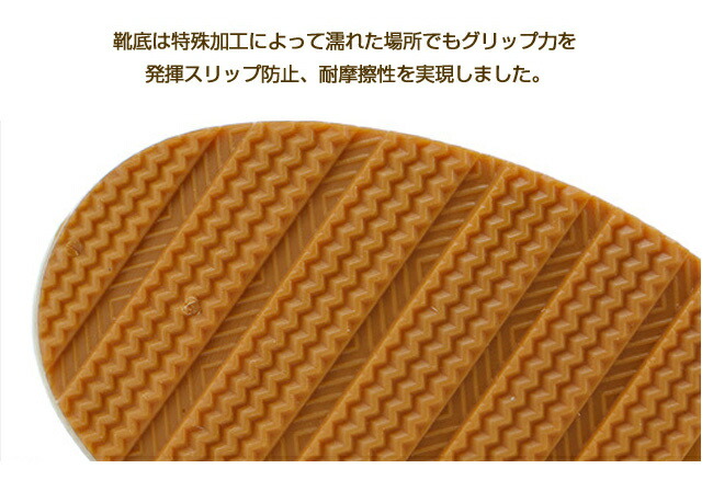 靴底は特殊加工によって濡れた場所でもグリップ力を発揮スリップ防止、耐摩擦性を実現しました。