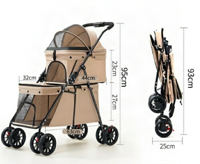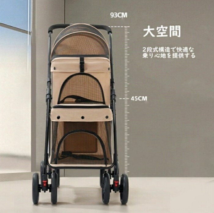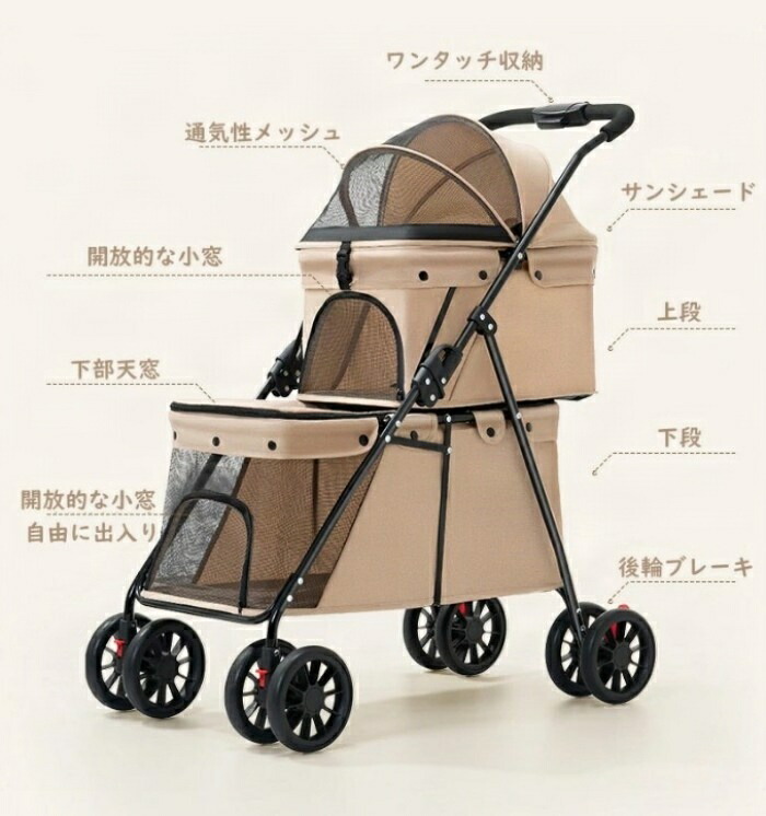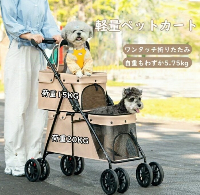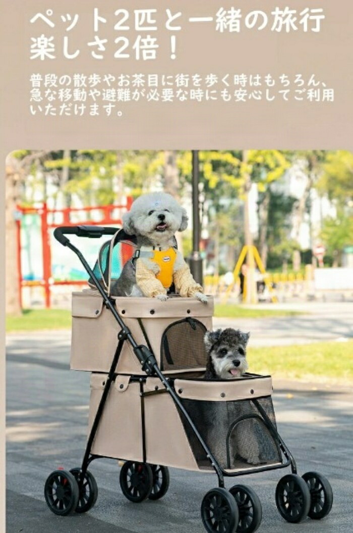 商品紹介 ペットと一緒のお出かけをもっと楽しく、もっと便利に。2階建てペットカートは、小型犬の多頭飼いにぴったりの多機能ペットカートです。2段式の設計で、上層には最大15kg、下層には最大20kgまでの荷重に対応しており、合計35kgまで大切なペットたちを安全に運搬できます。