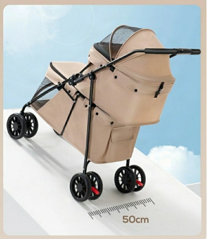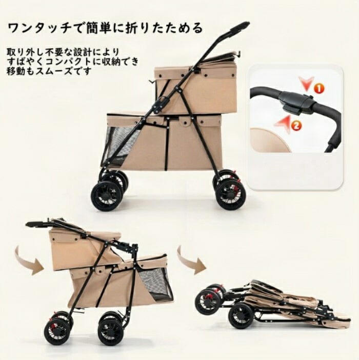 安全面でも安心の飛び出し防止リードが付属しており、飼い主様の不安を軽減します。豪華な4輪は、優れた安定性を持ち、凸凹道でもスムーズな走行を実現します。さらに、このペットカートは、防災用品としても使用可能ですので、災害時の安心感も得られます。