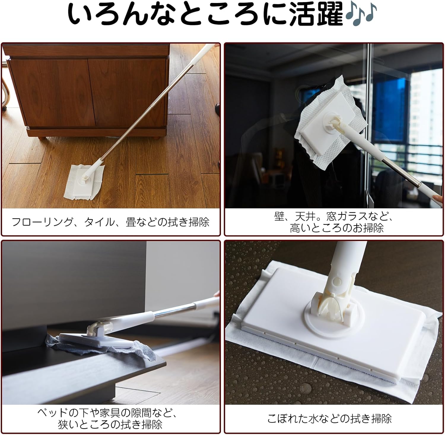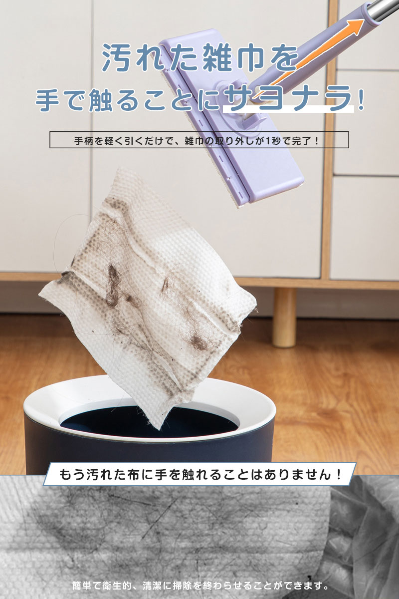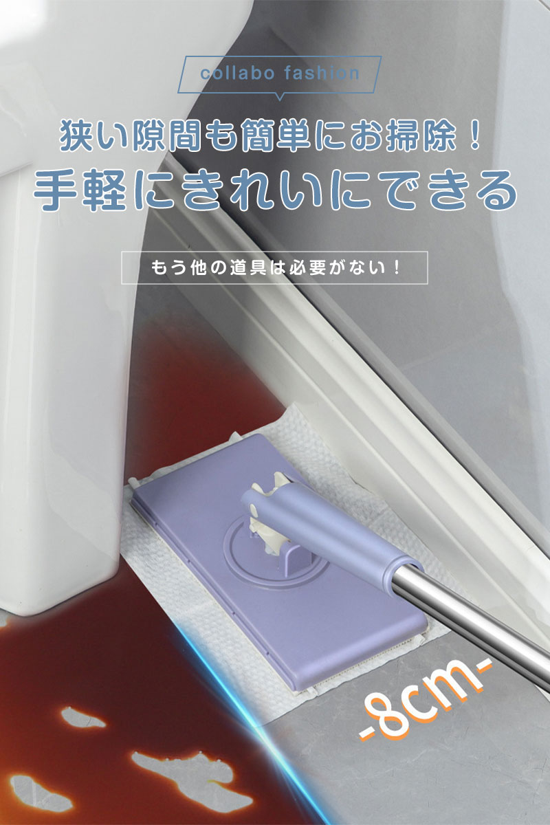 手を汚さないモップ、ワンプレスによる、自動シート交換可能、汚れたシートを手で触ることにサヨナラ。ワンタッチでシートを捨てるのが怠け者に大人気。腰を曲げたりしゃがんだりせずに、狭い隙間も楽に掃除できる。家中のあらゆる隅々までの汚れをこれで一発に解決!