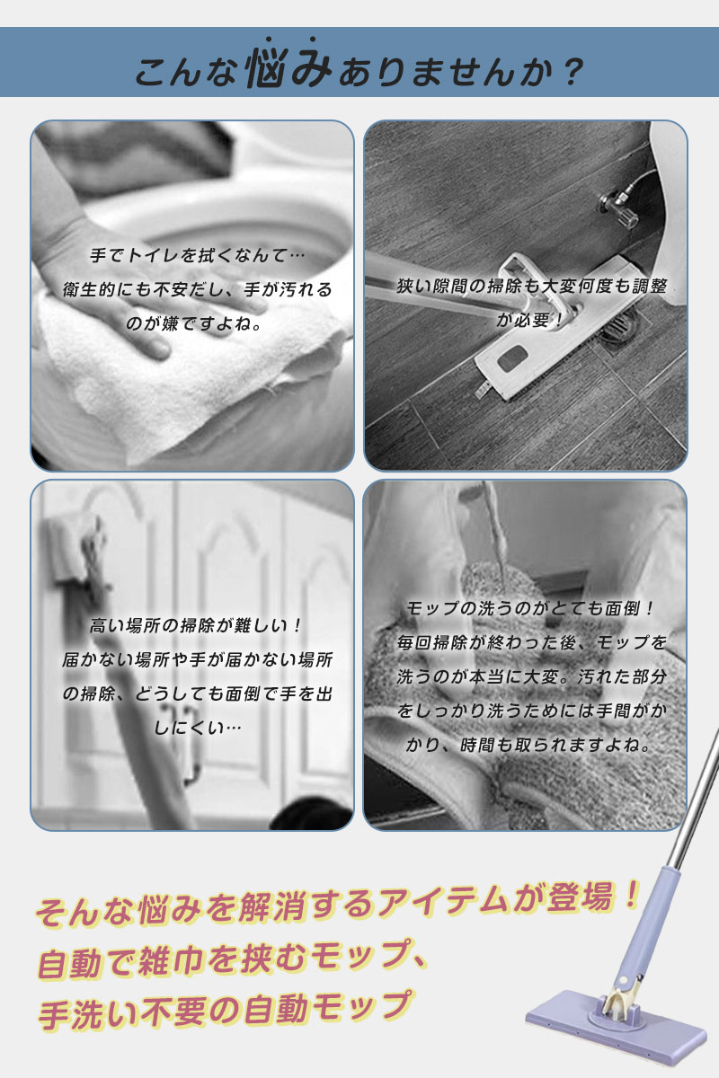 自動で雑巾を挟むモップ、手洗い不要の自動モップ、クレンジングタオルが一瞬でモップに変身、手洗い不要/自動でシートを挟む。ハンドルで軽く押す、1秒だけでクロスを挟める、従来の掃除方法を変える手を汚さず/接触しない/高所に使える、軽く回転させて、隅々まで清潔に。