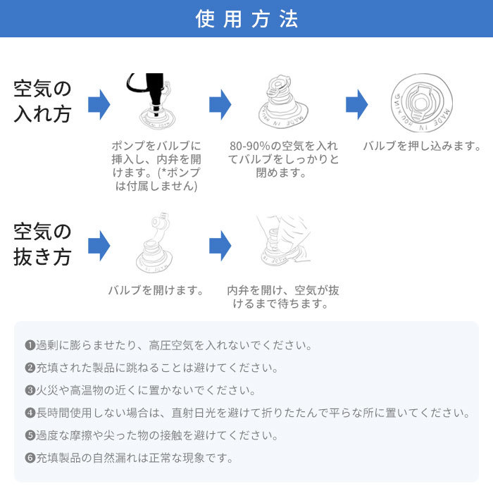(気温が低いと素材の特性上破損する場合ありますので、暖かいところで保管した後、空気を入れてください。)