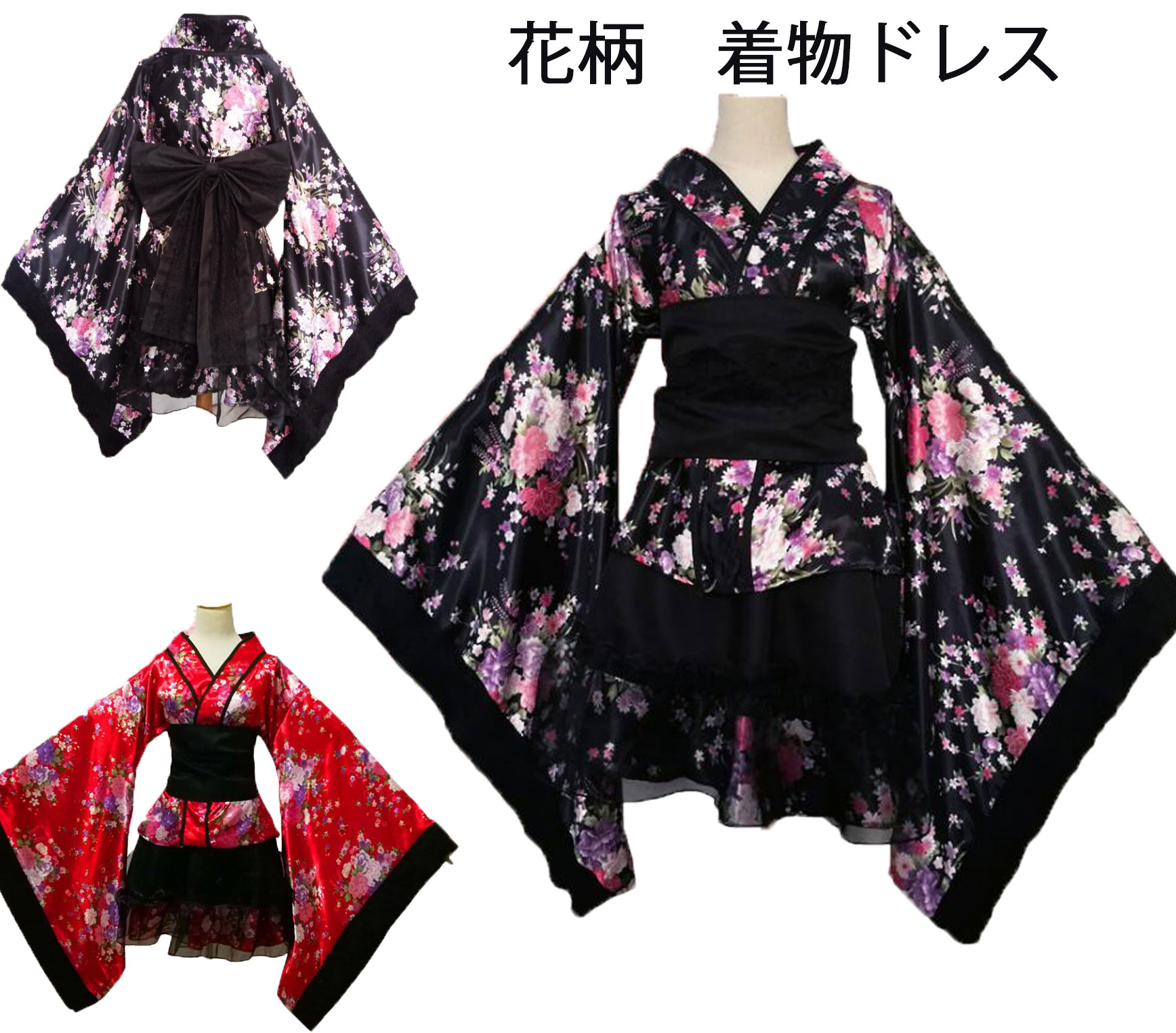 仮装 コスプレ ハロウイン 着物ドレス ミニドレス 浴衣 ダンス衣装 花魁 コスプレ キャバドレス 大人コスチューム 文化祭 ダンス 演劇 舞台 イベント 花柄 振袖 和風ドレス 4点セット 2色