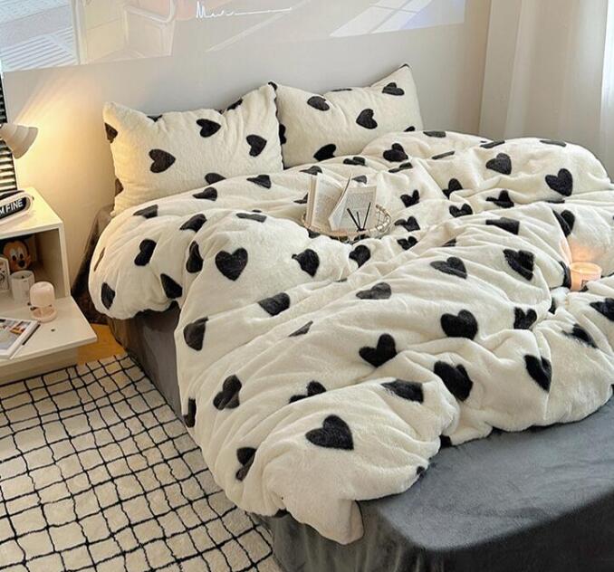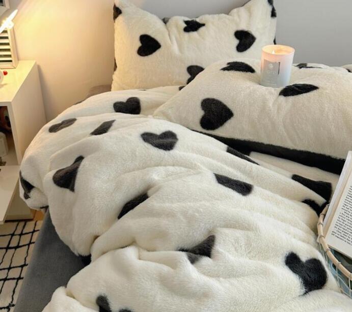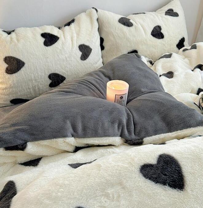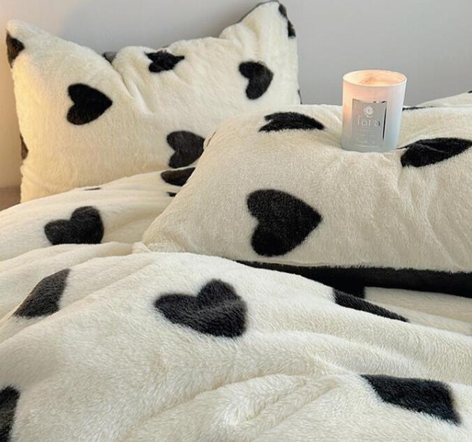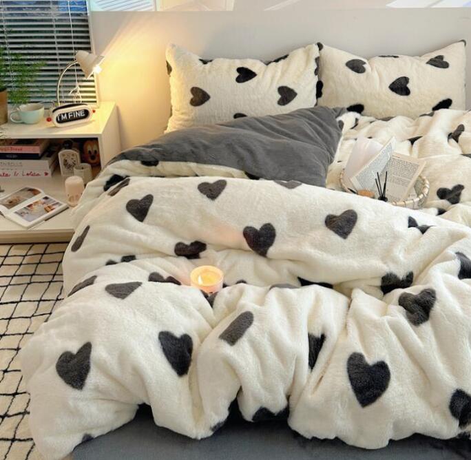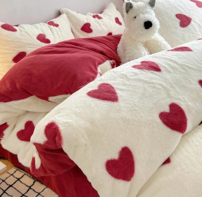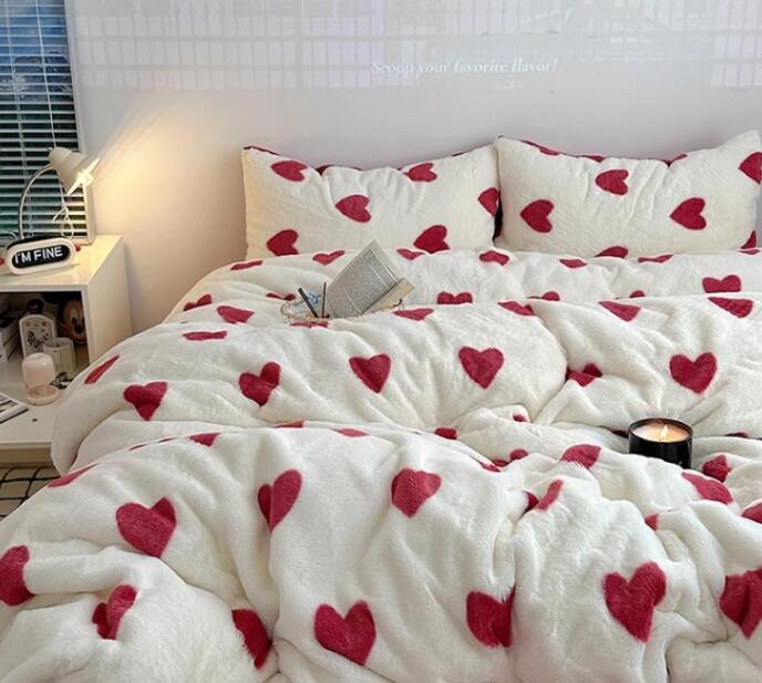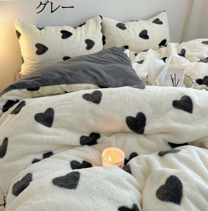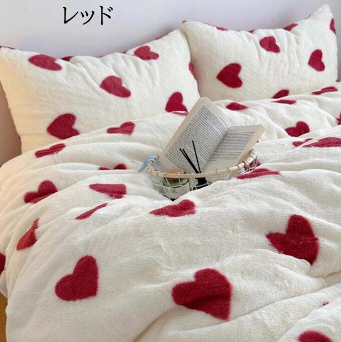 布団カバーセット 可愛いハート柄 厚手 暖かい 子供 大人 高級感 フェイクファー ふわふわ シングル ダブル クイーン フランネル 3点セット 掛け布団カバー フラットシーツ ボックスシ 4点セット