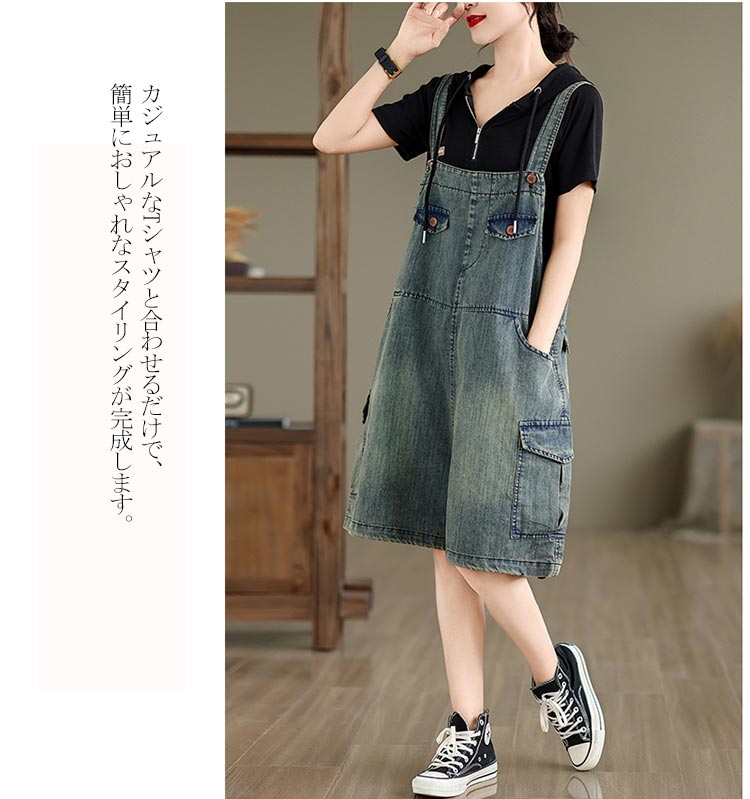 ジャンパースカート デニム デニムワンピース ロング マキシワンピース 春 秋 ロング丈 ジャンスカー サロペット 大きいサイズ デニムワンピ ポケット付き オールインワン 体型カバー ゆった ワンピ