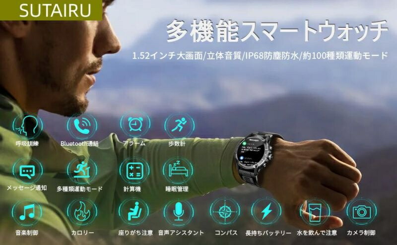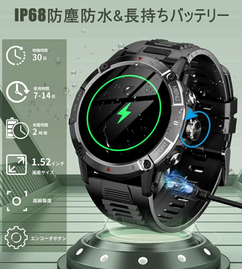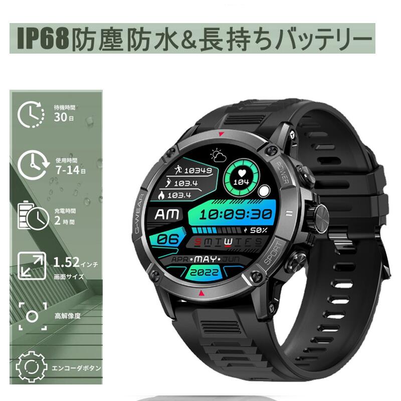 スマートウォッチ 【2024新登場 コンパス機能付き 1.52インチ大画面】IP68防水 Bluetooth5.2通話 約100種類運動モード smart watch Line/メッセージ通知 iphone android対応 長持ちバッテリー GPS運動記録 歩数計 腕時計 健康管理 メンズ 父の日 ギフトプレゼント