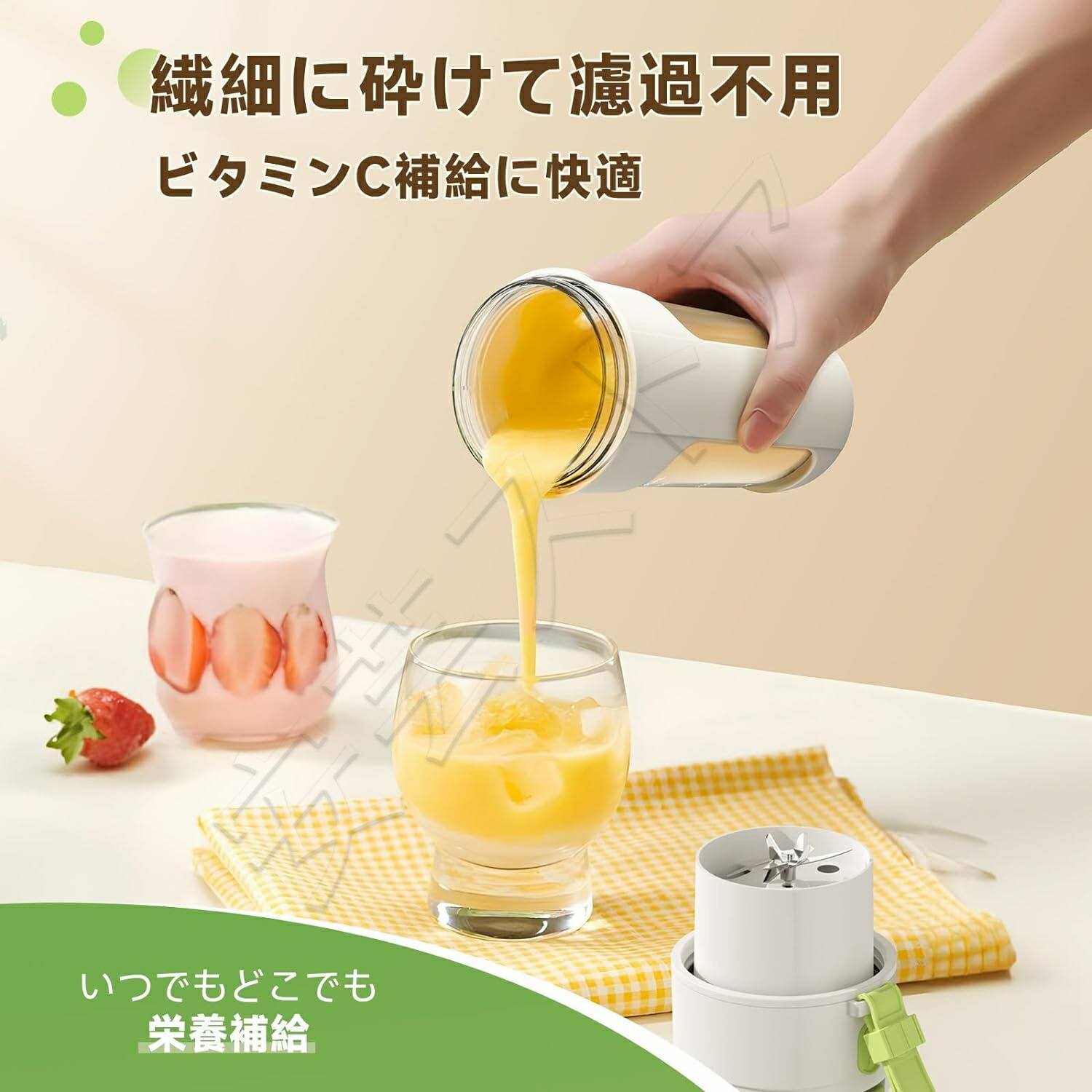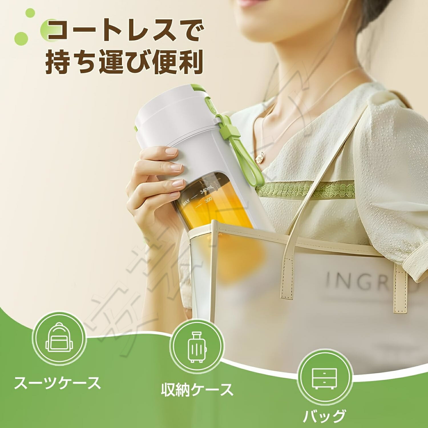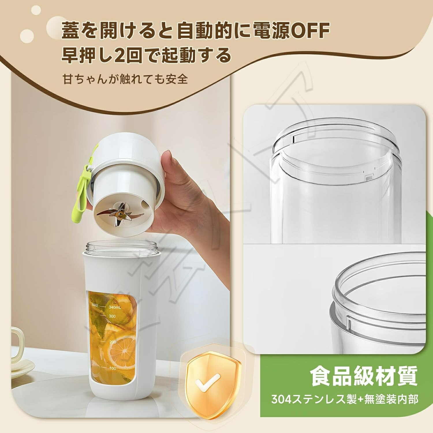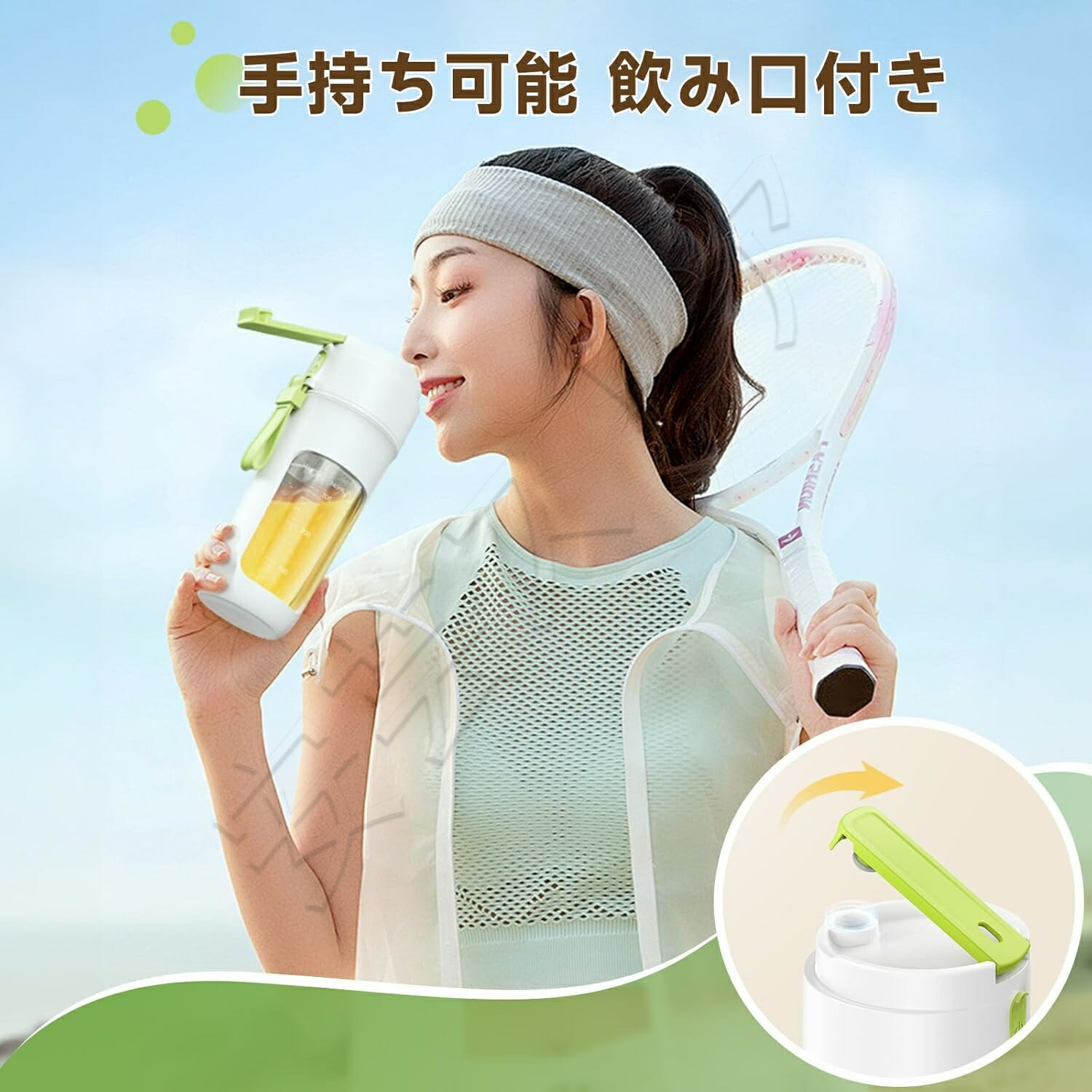 【使いやすい】 早押し2回で起動し、自動洗浄可能。大容量バッテリー、3時間でフル充電可能。フル充電状態、約9杯のジュースを作れる。独自の飲み口設計により、ジュースを注ぎ出す手間を省き、すぐ新鮮なジュースをお楽しみ。付属のシリコンストラップが付いており、、340mlのボトルとほぼ同じサイズで、家庭、オフィス、ジム、旅行に最適。