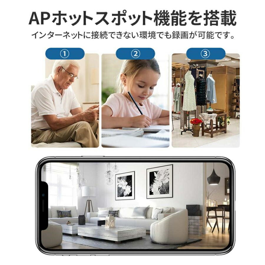 ・APモード機能搭載!インターネットがない場所でも適用!※通信距離制限があります。APモードで接続する場合、遠隔視聴とデバイス共有は利用不可になります。