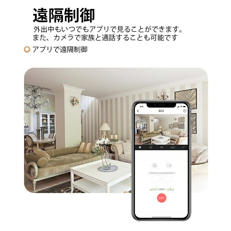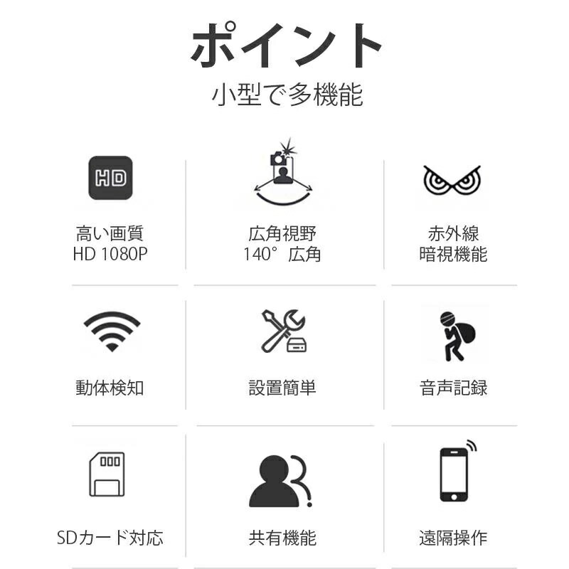 機能:APモード、遠隔監視、ビデオ撮影、WiFi対応、スマホ対応、夜間撮影、動体検知、160°広角監視、1080P、音声記録 給電方式:USBケーブル給電、バッテリー給電(約30分監視可能)