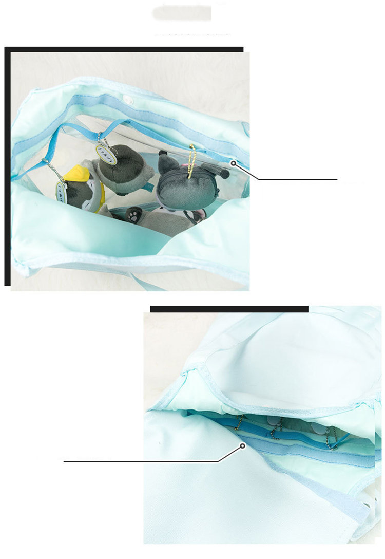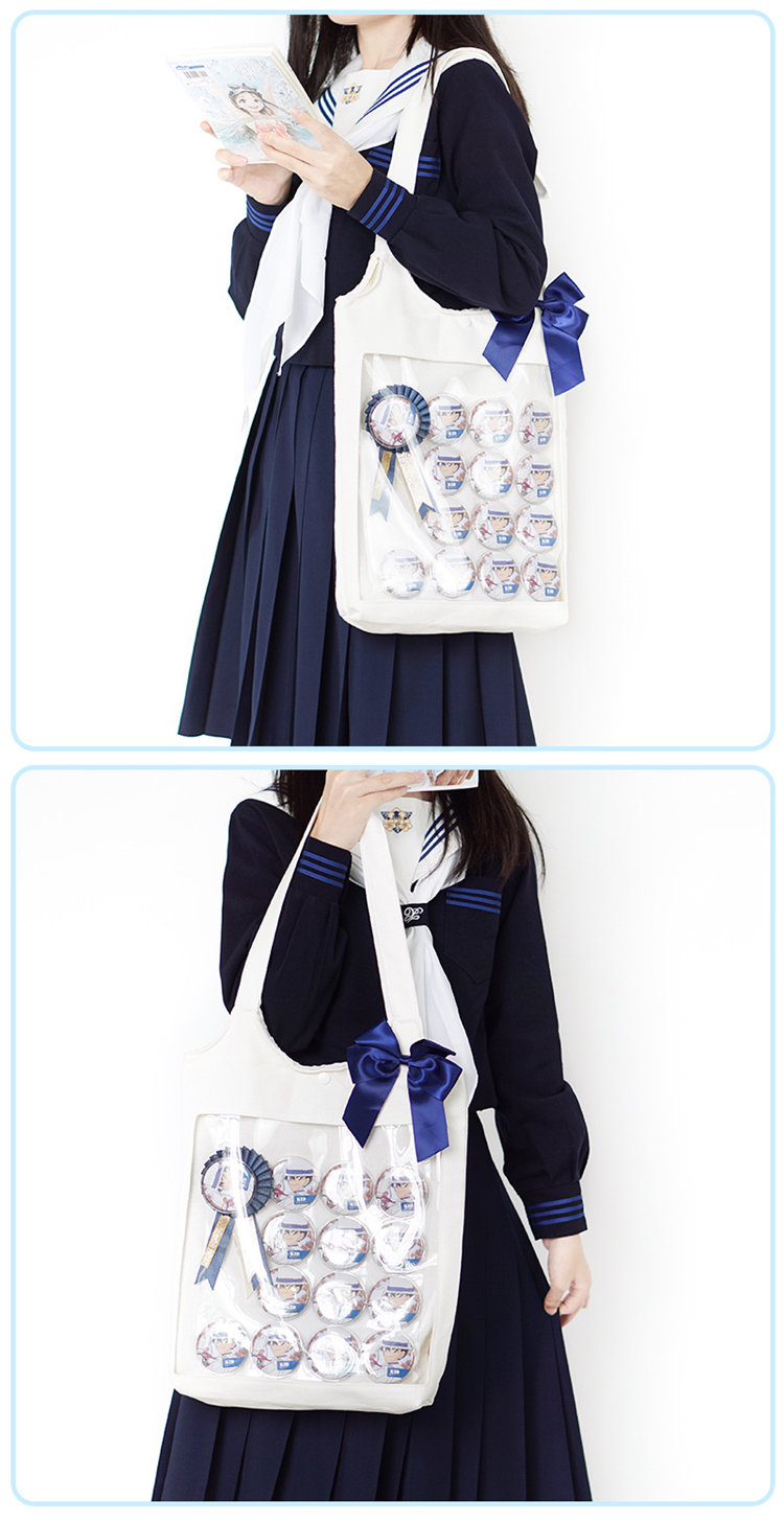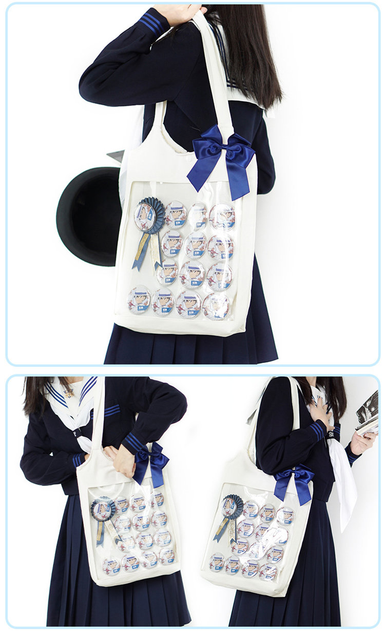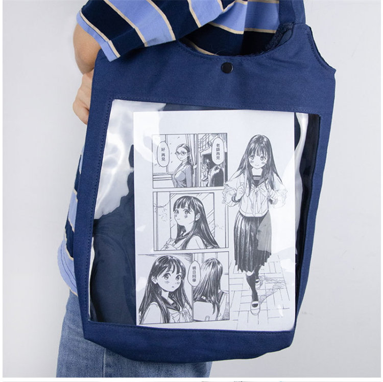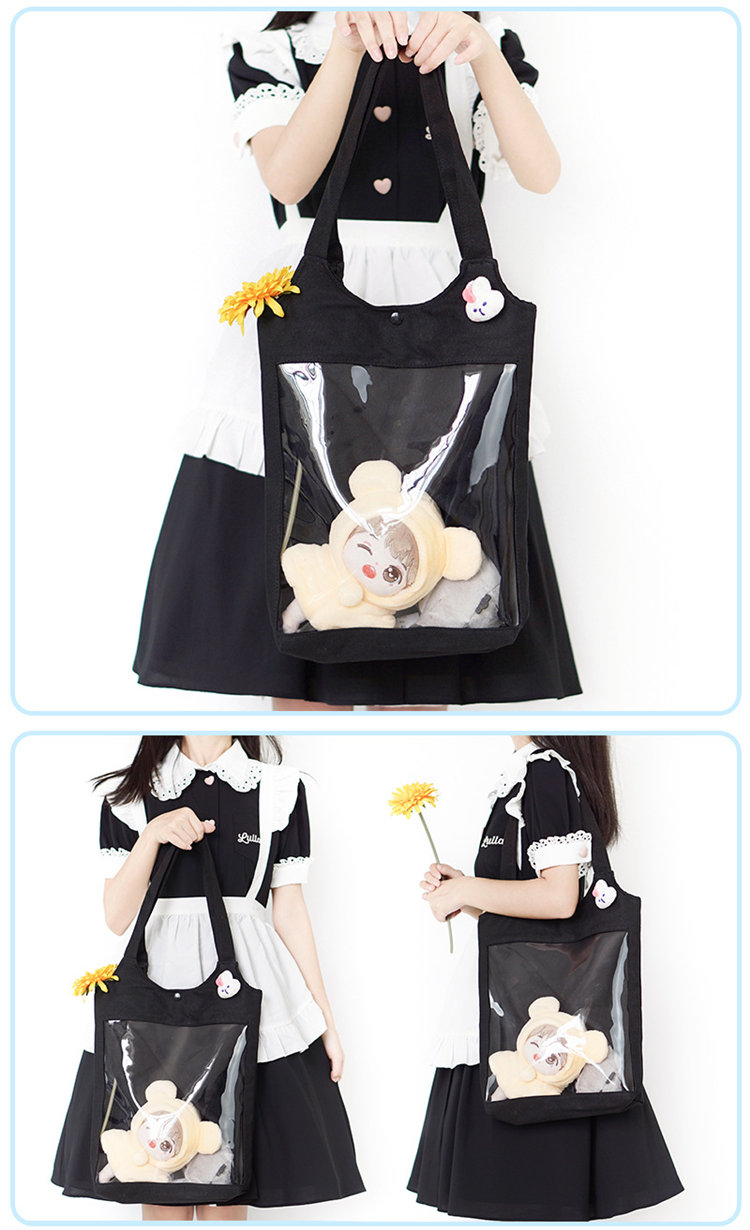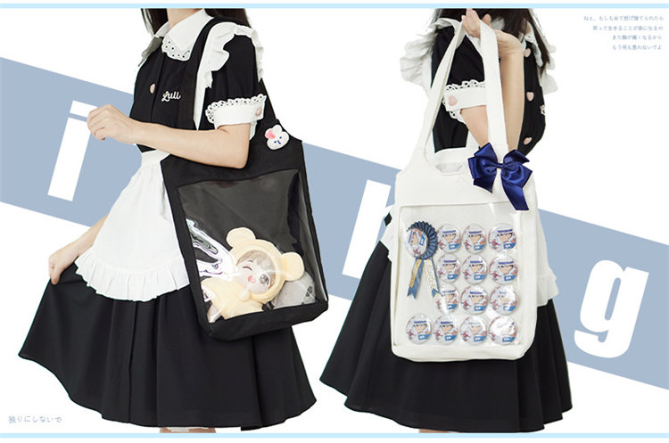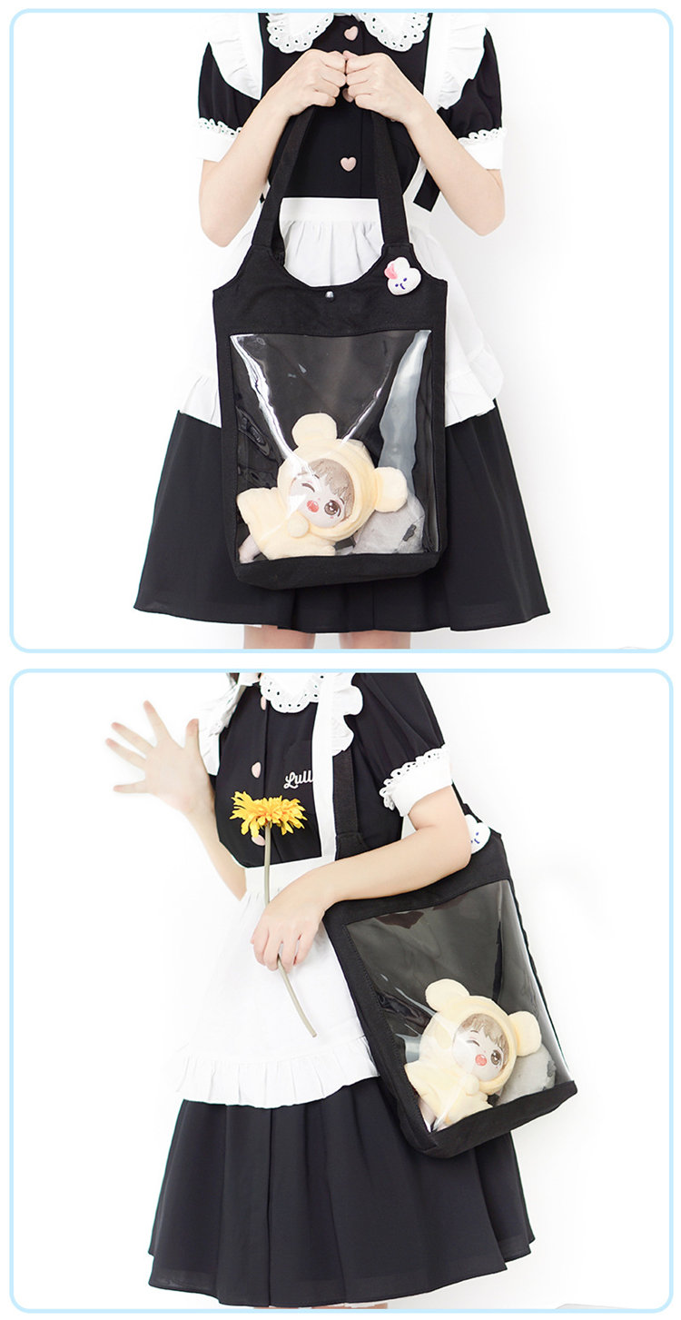 前の透明カバーに飾り板が入っていて、自分の好きな小物を入れることができるバッグです。 好きな芸能人や、アニメの写真 、缶バッジ、ストラップ、ぬいぐるみ、キーホルダーなどを入れるだけで、世界一つだけ自分のバッグです、毎日楽しく使える。