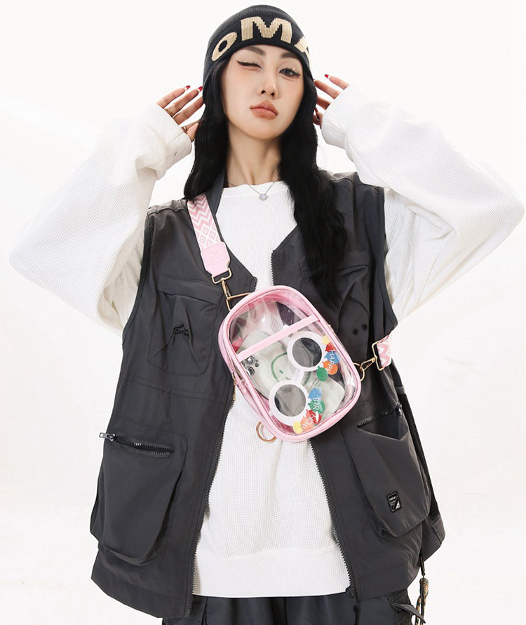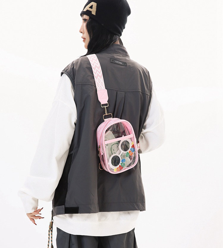 前の透明カバーに飾り板が入っていて、自分の好きな小物を入れることができるバッグです。 好きな芸能人や、アニメの写真 、缶バッジ、ストラップ、ぬいぐるみ、キーホルダーなどを入れるだけで、世界一つだけ自分のバッグです、毎日楽しく使える。