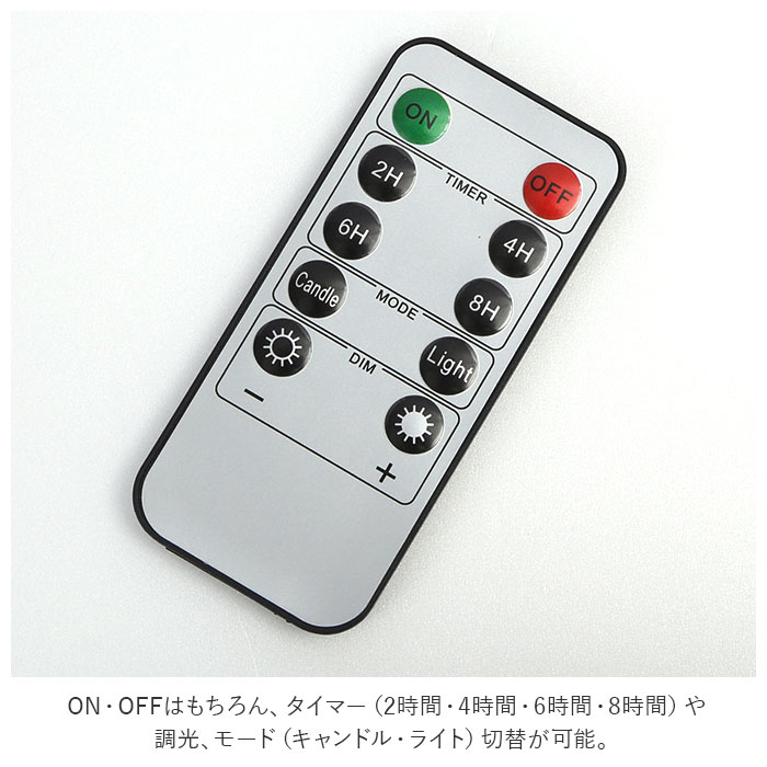 ・付属のリモコンでON・OFFはもちろん、タイマー(2時間・4時間・6時間・8時間)や調光、モード(キャンドル・ライト)切替が可能。