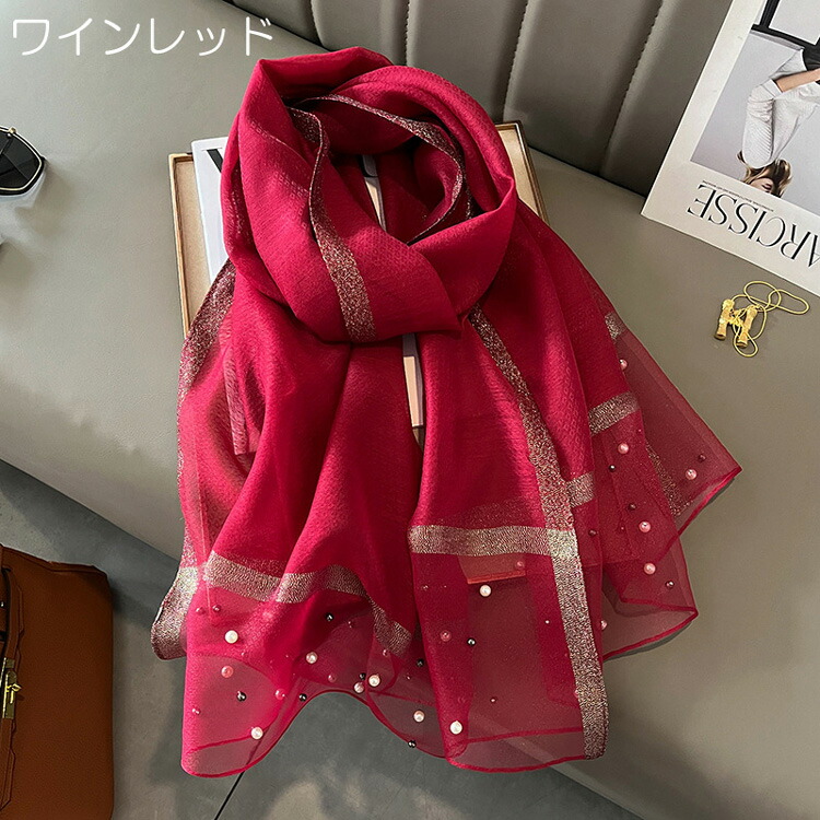 スカーフ 大判 全16色 パール付き ラメ糸 オーガンジー 70×190cm シルク調 ストール 黒 薄手 大きめスカーフ 大きい 長方形 レディース 母の日 プレゼント 日焼け防止 ビーチ ギフト