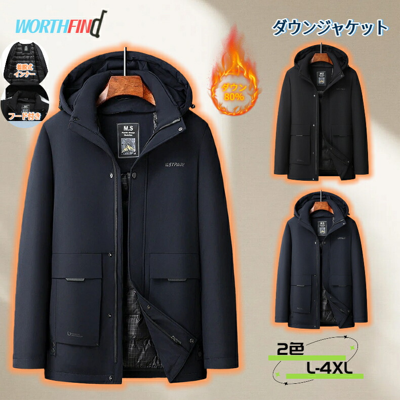 80%ダウン ダウンジャケット メンズ フード付き ダックダウン インナー付き インナー取り外し可 ダウンコート ショート 3way ライトダウンジャケット 防寒 軽量 保温 無地 ウインドブレ 長袖