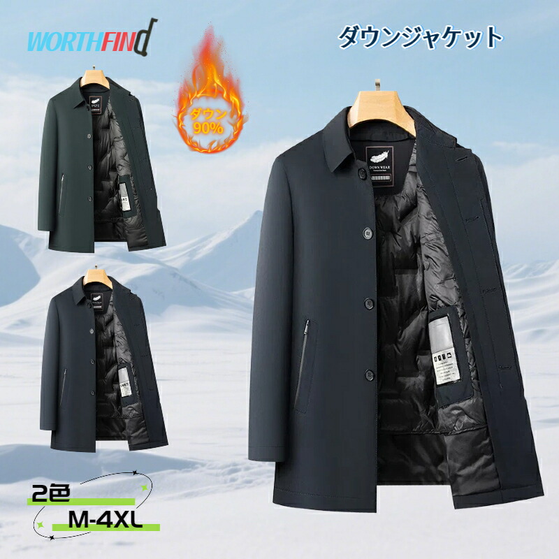 ダウンコート メンズ 90%ダウン 折り襟 ダウンジャケット ダウンアウター ミドル丈 アヒルダウン ダックダウン ビジネス 防寒 防風 暖かい ライトダウンジャケット 大きいサイズ 長袖 保温 軽量
